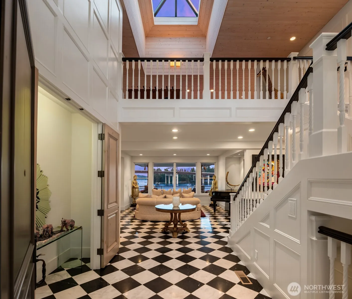 Private one-of-a-kind waterfront estate! A gated drive leads to this stunning waterfront retreat sited on 75 ft of sunny southwestern Lake Washington waterfront. This grand home offers unlimited possibilities for a tailor made lifestyle. From poolside lounging to lakeside living. Bask in commanding Mt. Rainier views and dazzling sunsets as you watch the water craft on Lake Washington’s East Channel. A substantial dock has a protected slip and lift along with plenty of space for all of your water toys. Step into the two story entry where stunning black and white marble floors are a WOW as you enter while creating an air of urbane sophistication. Skylights above bathe the main floor in natural light. Generous day rooms open to the outside. The reimagined chef’s kitchen will thrill even the most discerning and boasts the latest “must have” for serious cooks, a separate prep kitchen. A main floor study tucked behind the kitchen offers a quiet place for work or homework. Built with aging in place in mind an elevator can be easily be added to transport you directly to the Primary Suite. Four safe rooms are fire resistant to 2,000 degrees and have panic buttons. Upstairs is currently a family/game room; plans come with the property to create an upstairs Primary or Guest Suite. Storage galore including extra space in the garage.