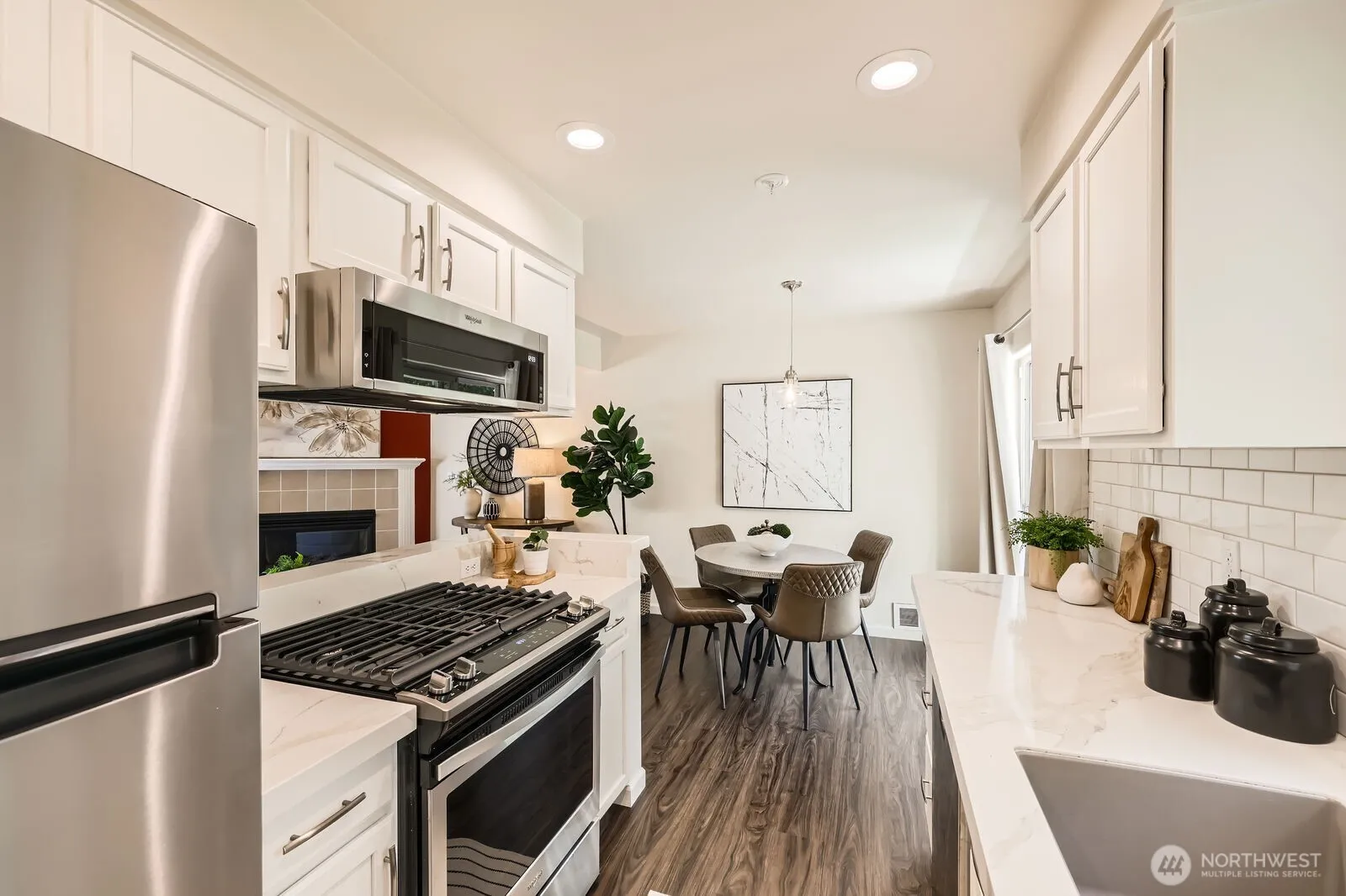 Secluded, remodeled and sunlit, this inviting and quiet end-unit townhome offers 1 bedroom, 1.5 baths, and a seamless indoor-outdoor flow. Beautifully updated with quartz counters in the kitchen and baths, vinyl plank flooring, modern lighting, fixtures, doors, and paint. The open design features a sleek kitchen with newer stainless appliances, a living room w/cozy fireplace, and sunlit dining. The large, fenced backyard with a private deck is perfect for relaxing and for pets to play. The spacious primary suite offers a walk-in closet, full en-suite bathroom & W/D. Enjoy Woodinville’s nearby trails, parks, wineries, and easy commuting. Side-by-side, spacious garage & carport! Pre-inspected. Low dues. No rental cap. New roof (2021).