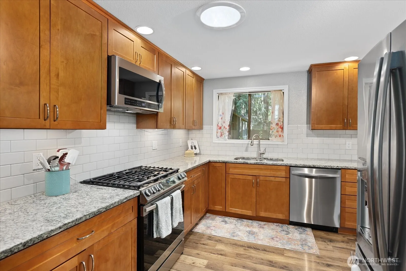 Spacious and beautifully updated PNW classic in coveted Cottage Lake! Nestled on a large lot at the end of a quiet cul-de-sac with top-rated Northshore schools. 3 beds+Bonus Room/2.75 baths. Soaring vaulted ceilings, light-filled windows, rich bamboo floors & a cozy fireplace welcome you in. The sleek Smart Kitchen flows to a new Trex deck—perfect for morning coffee or gatherings. Upstairs, retreat to a tranquil primary suite with jetted tub and walk-in closet plus two more bedrooms & full bath. Downstairs, large rec/family room w/ tall ceilings, pellet stove, plush carpet opens to a paver patio and yard. Bonus guest room + ¾ bath. New roof, paint, carpet, furnace, electrical panel, generator hookup & more. Walk to parks, school and more!