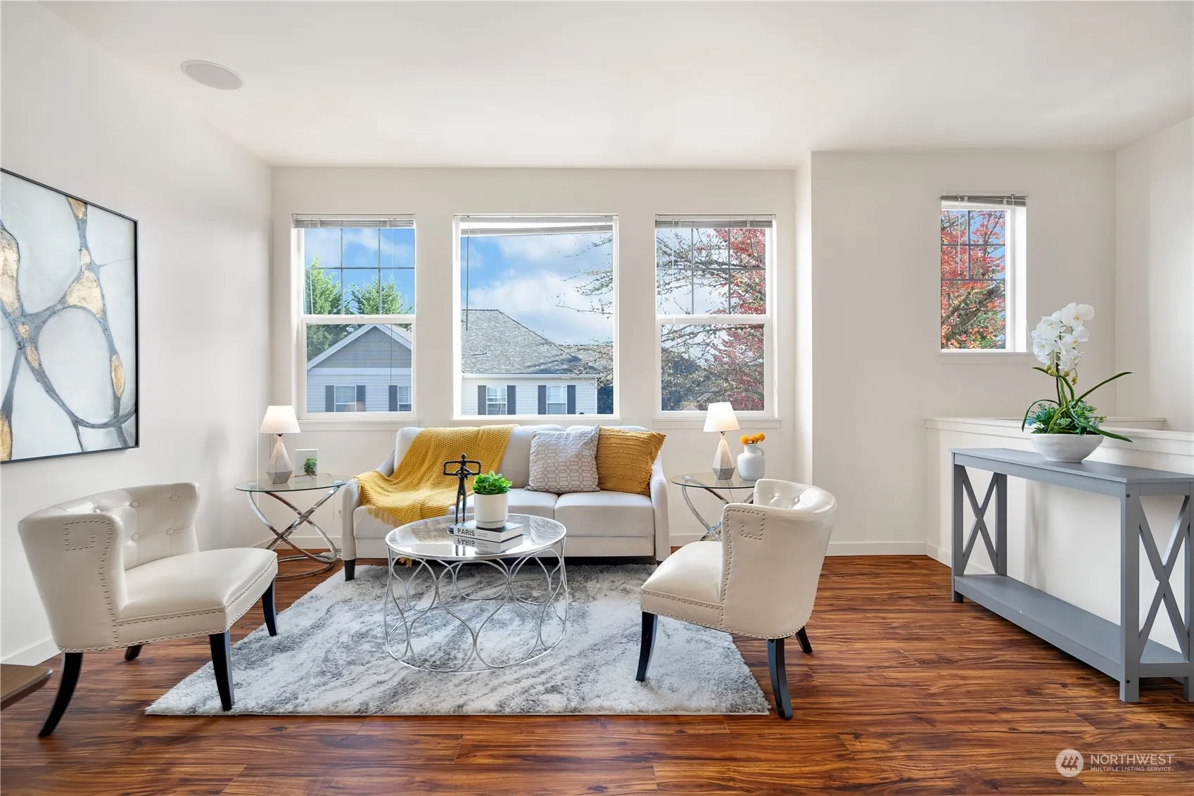 Welcome to Hawthorne, a luxury Burnstead townhome in the heart of Woodinville Wine Country! Situated on a quiet street, this home offers 9-ft ceilings, a gas fireplace, built-in speaker system, and an alarm system. The open floor plan flows seamlessly from the well-equipped kitchen to the living room, perfect for entertaining. Enjoy valley views from the primary bedroom with an ensuite featuring a dual-head shower and walk-in closet. A deep soaking tub enhances the second bath. The private patio off the kitchen is ideal for outdoor dining. Tandem two-car garage, washer/dryer, and bonus pedestal washer included. Surrounded by trails and open space! Pre-Inspected for your peace of mind.