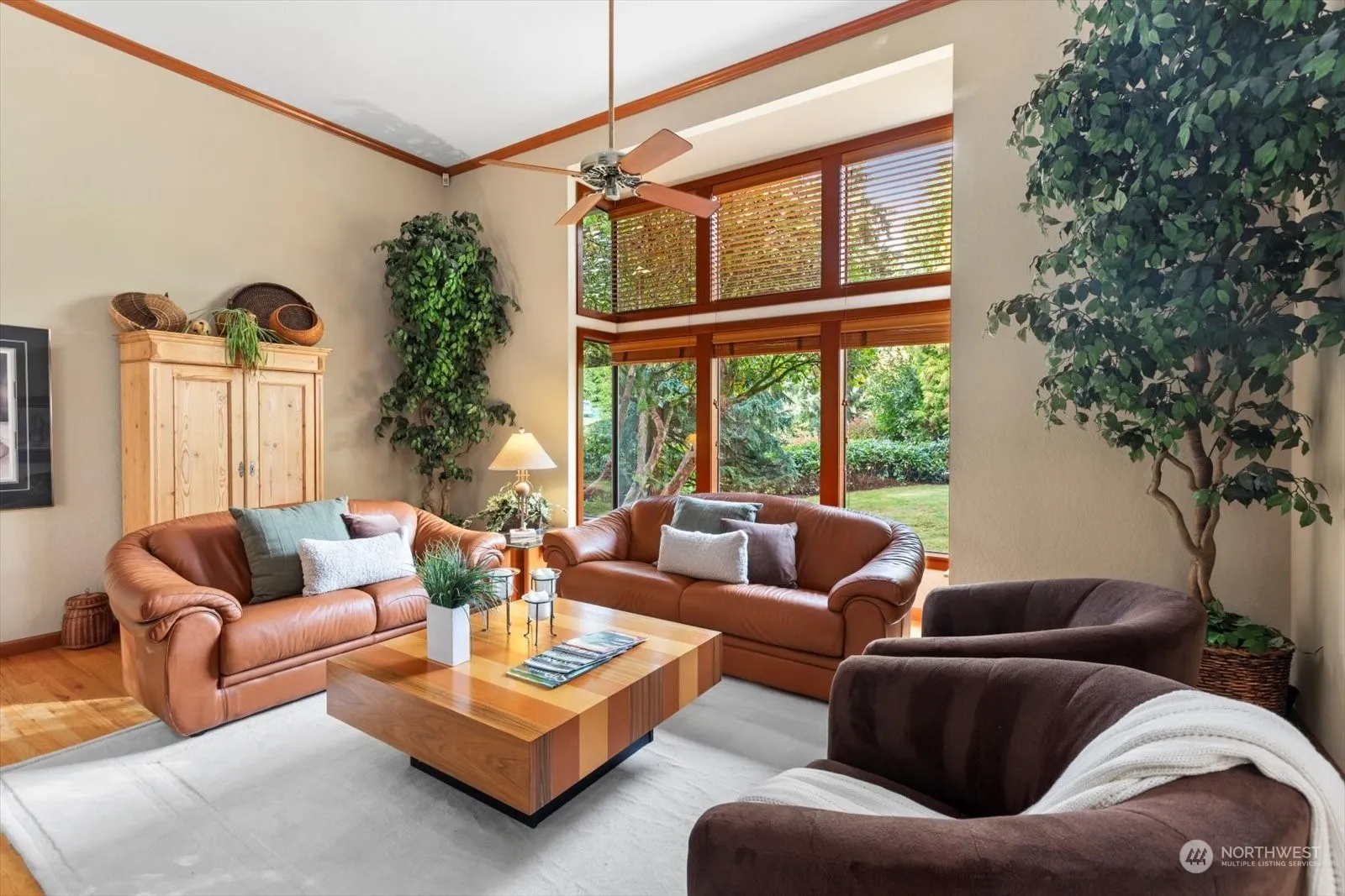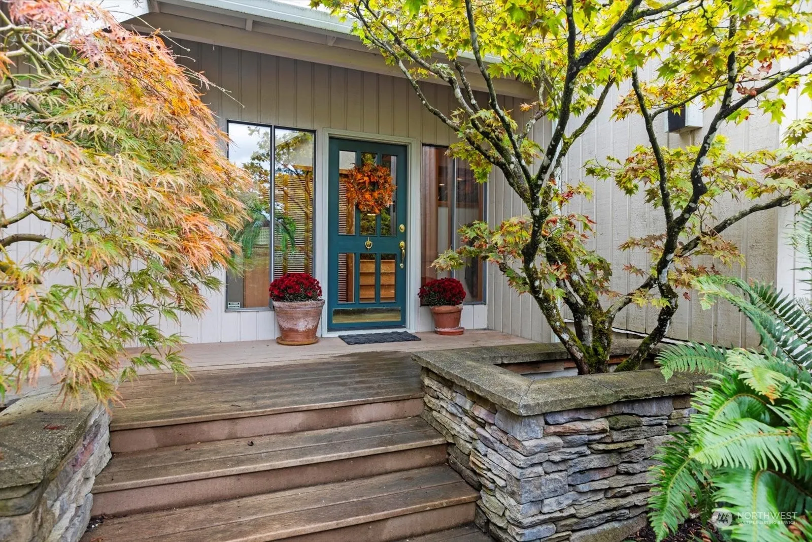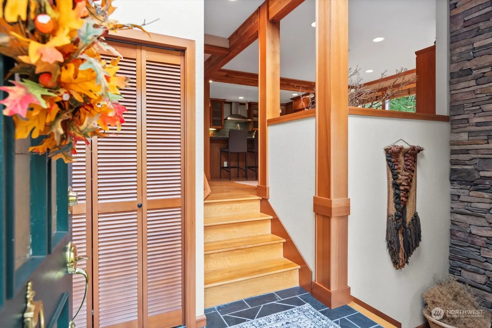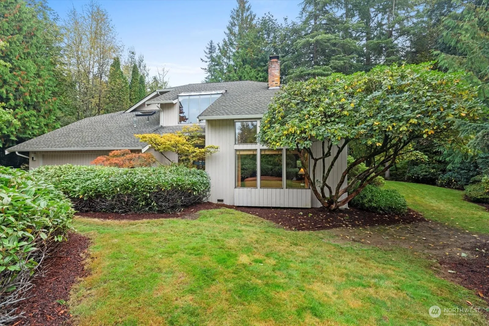 Quintessential Woodinville, NW contemporary lodge like home. Tall ceilings with warm wood beams and accents greet you. Huge windows to capture the natural setting. Large stone wood fireplace with rustic mantel. The 2nd floor features an open and remodeled kitchen and island, wonderful for entertaining. Open dining area and a family room with gas fireplace and tons of built ins. French door to deck overlooking greenery. Next level features a cozy TV room w/ wet bar and an attached office. Top floor features the bedrooms, full bath and primary suite with attached bath and balcony overlooking the tranquil backyard. All set on a shy acre, minutes to downtown Woodinville, wine country, restaurants, easy access to 405. This is a special property!