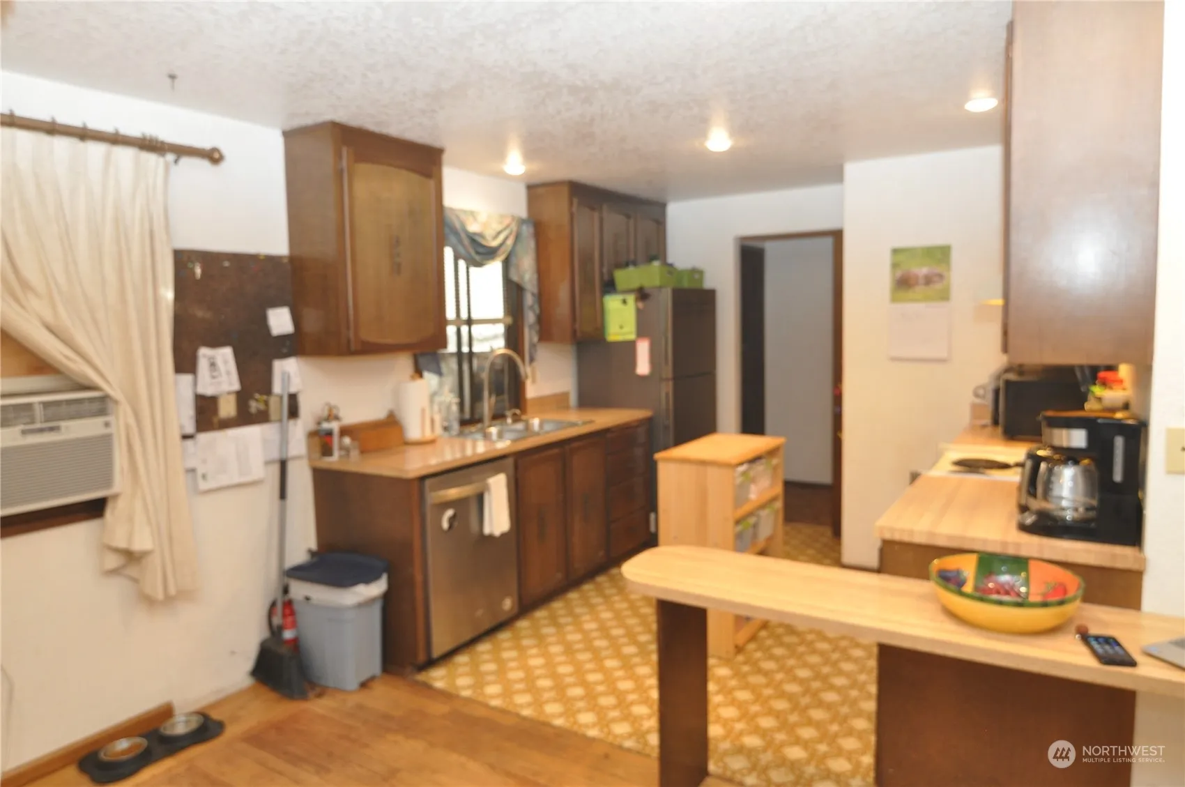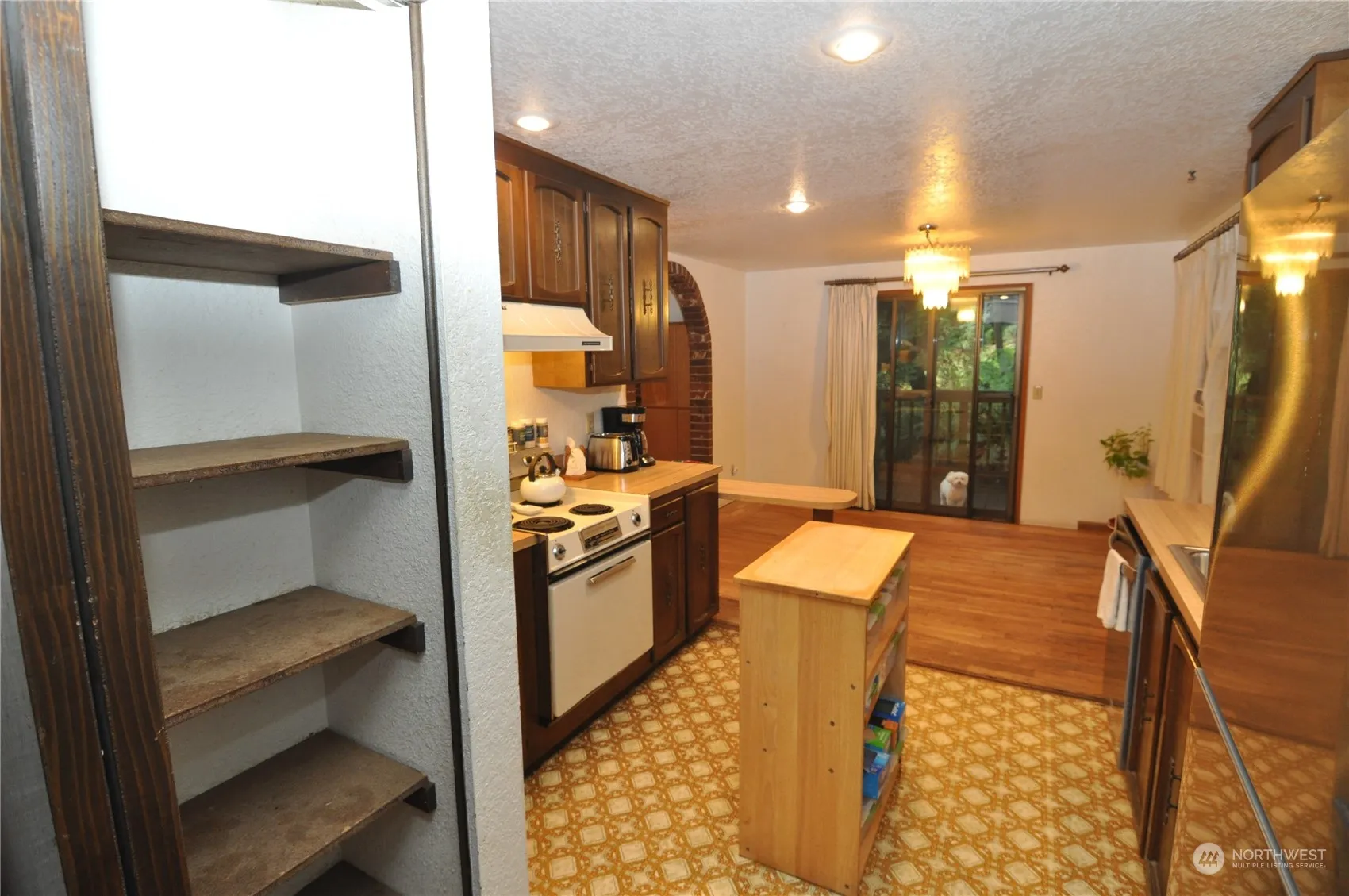 Diamond in the rough! Nice layout to this home, lots of potential. Three bedrooms on the main floor, potential for another bedroom and full bath downstairs – buyer to decide. Basement with super high ceilings is roughed in waiting for completion. Main floor has kitchen, DR, LR and 3 bedrooms. Oak hardwood floors are installed at 45 degree angle in LR, a nice design touch. Wood-burning fireplaces in living room as well as downstairs. Primary bedroom has adjoining 3/4 bath and a wall of closet space, as well as a slider door out to the wrap-around deck. Large lot has plenty of trees, plus the property abuts greenbelts behind and in front of the home.