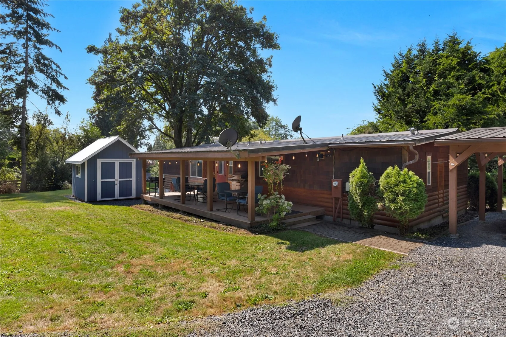 Updated two bedroom, 1.75 bath manufactured home conveniently located just minutes from Woodinville wine district! Nice layout w/ sunny south facing living/dining room & central kitchen with an eating bar. Back & front covered porches provide lots of outdoor living space options & offer year round enjoyment. The 50 year metal roof adds to the longevity of the home & heat pump provides heating & cooling for your comfort. Home sits back off the road on 4.2 acres of partially cleared, partially wooded, idyllic land w/ a small creek running through. Detached carport offers (2) covered parking spaces & new shed adds lots of dry storage. Adjacent property for sale for multigenerational-living situation or own and operate B&B. See MLS#2292445