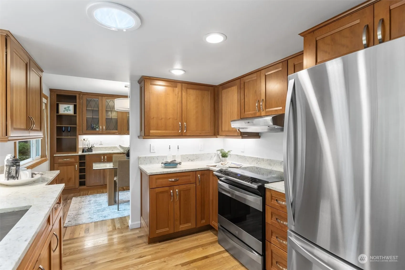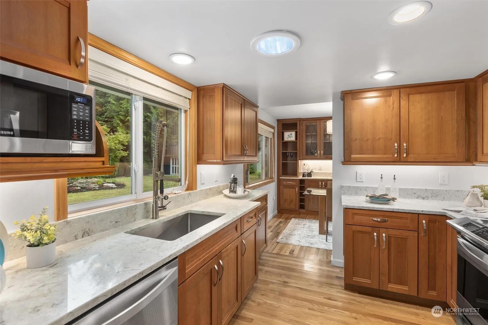 Spectacularly updated rambler on pristine corner lot in prime Woodinville location! This light & bright home has been meticulously updated & maintained. The high-end kitchen was redone in 2016 w/brand new cabinets, under cabinet lighting & quartz countertops. Dining area features amazing built-ins. Primary bedroom fits a king bed & has a walk-in closet that passes through to the fully redone bath. Family room off of kitchen w/wood burning place provides second seating area & solar tubes for added light. Slider leads to the fully fenced, professionally landscaped level backyard w/3 storage sheds as well as RV/Boat parking. Hardwoods throughout, 2 car garage, A/C, Northshore schools & A+ location close to 522/405 make this the perfect home!