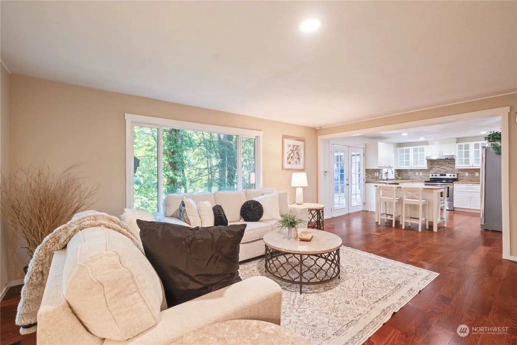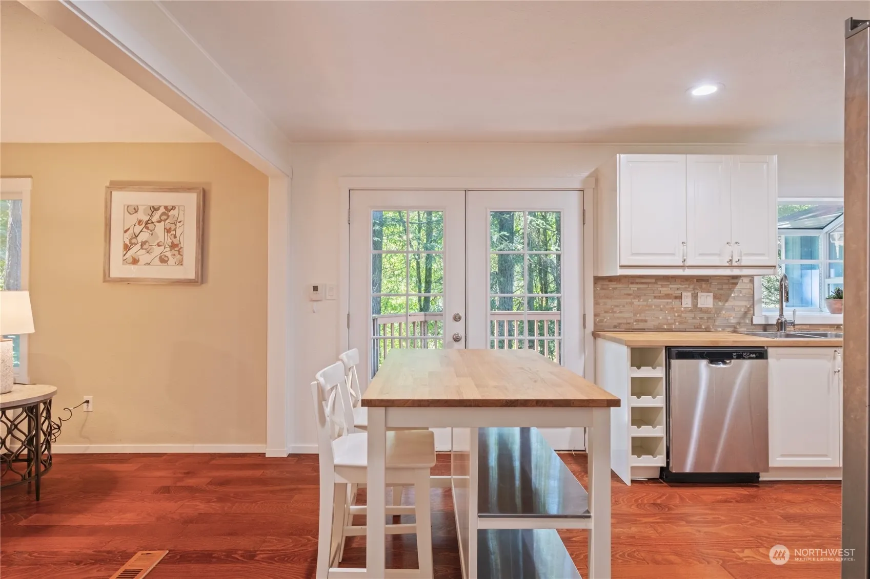 This stunning 3-bedroom, 1.75-bath home is filled with charm and natural light. Skylights throughout illuminate the spacious interior, which features beautiful hardwood floors in every room. The updated kitchen, complete with modern appliances and ample counter space, opens to the private back deck through elegant French doors—perfect for outdoor dining and entertaining. French doors in the master bedroom also lead to the tranquil backyard. Two versatile living spaces provide room for relaxation, while the large master suite offers a private retreat. Enjoy a private front and back yard, all within the highly desirable Northshore School District and just minutes from Woodinville wine country. This home is a perfect!