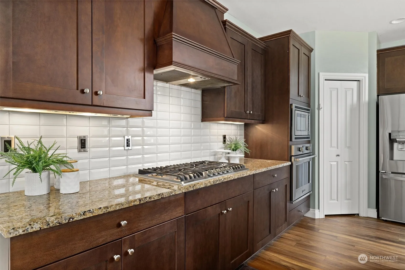 Located in the desirable Vinterra community, this 5-bed, 3.25-bath home features two primary suites, each with attached baths and spacious walk-in closets. The open floor concept seamlessly blends the kitchen, breakfast nook, and living room, perfect for modern living. A custom chandelier adds a luxurious touch to the high-ceiling entryway. The dedicated home office is ideal for remote work. Outside, the deck leads to a fully-fenced backyard with artificial turf, perfect for easy maintenance. With a 2-car garage, ample crawlspace storage, easy access to 405, and a community park, this home combines comfort, convenience, and style. Front door facing East