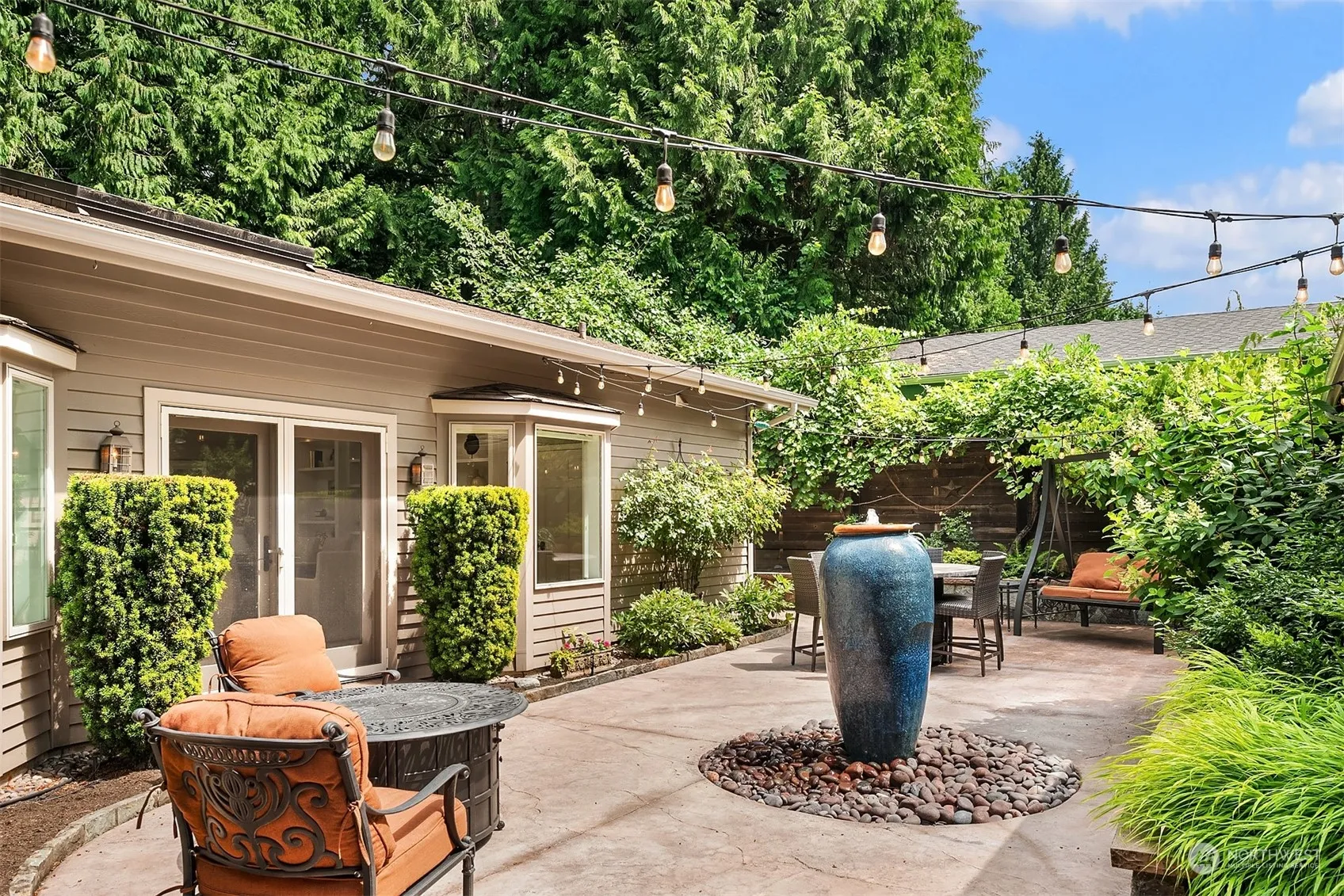 Beautiful one level home in a park-like setting. The kitchen opens to the sun filled great room with vaulted ceilings and views of your private retreat. The great room french doors open to the Zen gardens and the windows showcase the patio and fountain. The sunroom room off the kitchen is ideal for your morning cappuccino or work from home. Spacious kitchen made for a chef with great appliances. Den, living room/bonus & a quiet primary with fireplace. Two patios and a deck, ideal for gatherings & celebrations. 3 car garage and the home is wired for a generator. Quiet and lovely neighborhood. Minutes to shopping, tech, restaurants, schools. Landscaping frames the home like the homes you only see in magazines. Might be love at first sight.