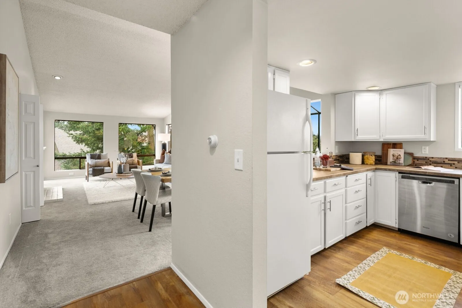 Welcome to Sunwood Condos! Rare top-floor, corner unit is move-in ready and filled with natural light. The spacious main living area features a cozy wood-burning fireplace and a built-in bar area—perfect for entertaining. A dedicated dining space includes a charming window seat that creates the ideal reading nook. Large windows throughout fill the home with natural light. The well-appointed kitchen offers generous workspace, ample storage, and a convenient pass-through to the dining area, making it easy to stay connected while cooking or hosting.The spacious primary bedroom includes a private en suite bath and great closet space. A second bedroom provides flexibility for guests, a home office, or hobby room. An additional full bath and laundry closet with extra storage are conveniently located in the hallway.Step outside to your private balcony—perfect for relaxing on warm summer evenings. The unit includes one reserved covered parking space plus plenty of visitor parking. Well-managed HOA with great amenities including a pool, hot tub, tennis courts, and clubhouse. Fantastic location just minutes from Westfield Southcenter Mall, dining, shopping, SeaTac airport and major commuter routes.