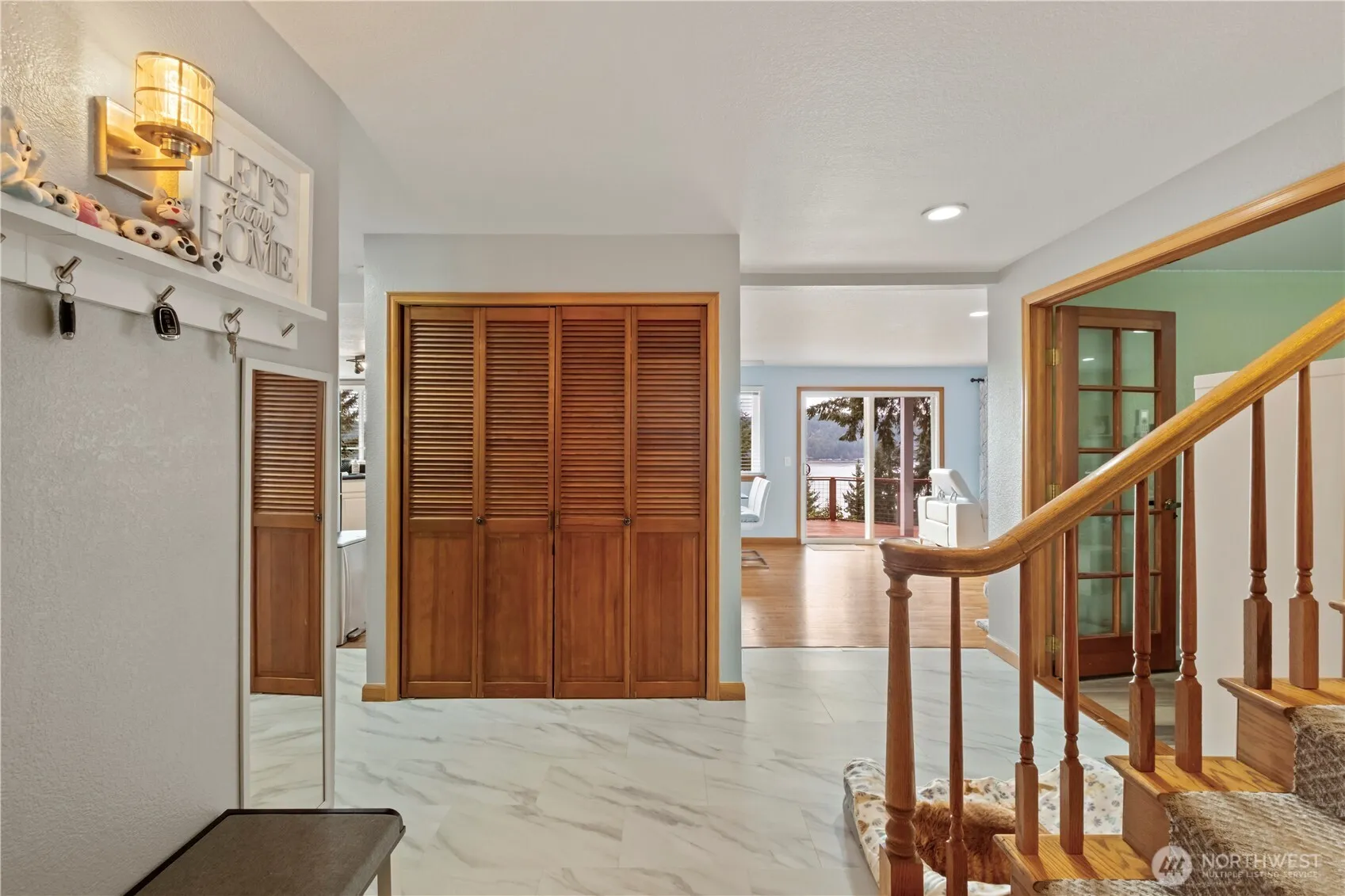 Imagine waking up to awe-inspiring views of Hood Canal, watching orcas, eagles, otters and other wildlife from every bedroom in this magnificent two-story sanctuary! This 4-bedroom, 3-bathroom home has been meticulously upgraded with new paint, windows, doors, and flooring. Every bathroom has been artfully remodeled, including the master ensuite, which includes a large walk-in closet. The open-concept living room and kitchen are perfect for entertaining, while the new ductless A/C unit ensures comfort year-round. Add a whole-house generator hookup, an oversized three-car garage with an E-car charging station hookup, hot tub, and a private beach and boat ramp. A dedicated office/playroom makes this property functional as well as beautiful. This is an ASSUMABLE VA Loan with a manageable Gap.