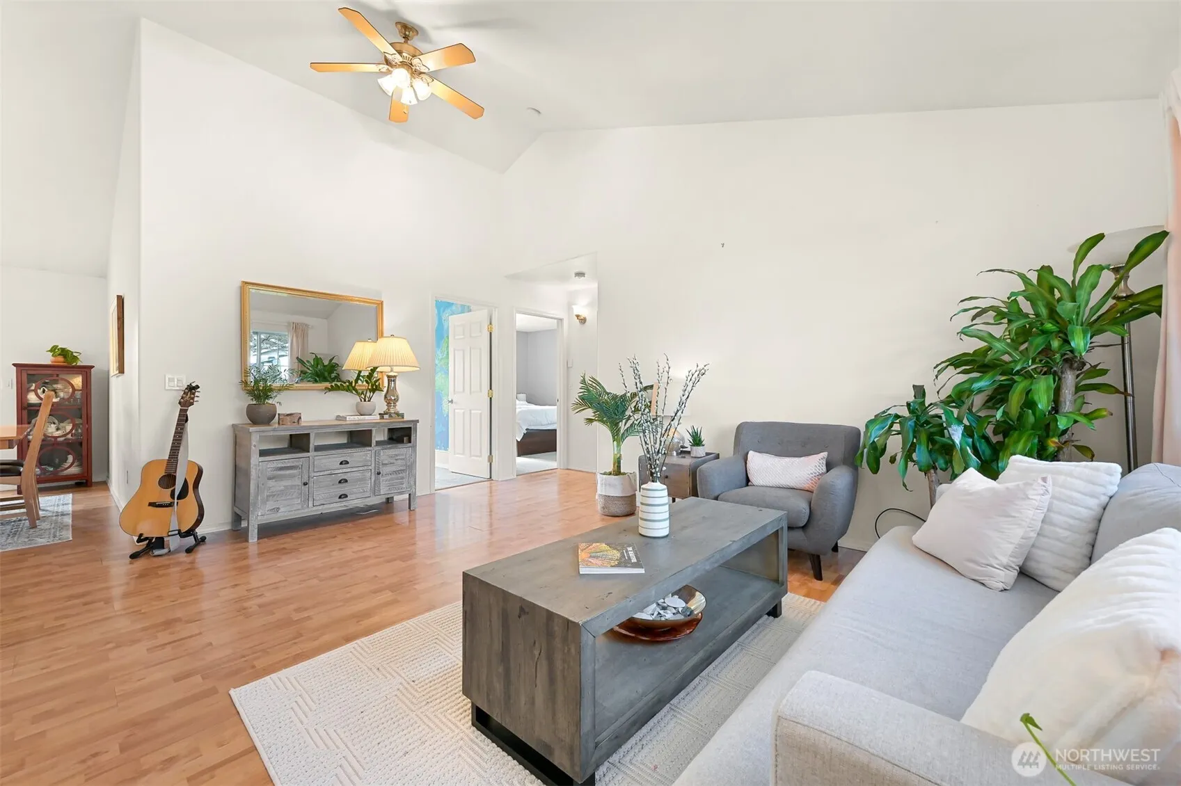 Light-filled and spacious, this 4-bedroom, 2-bath home offers comfortable single-level living on an expansive ~9,800 sq ft sun-filled lot in the sought-after Birch Bay Village community. Vaulted ceilings and bright living spaces create an open, welcoming atmosphere throughout. The thoughtful layout places the primary suite on the opposite side of the home from the other bedrooms, offering added privacy. The primary retreat includes an en suite bath, laundry, and a versatile flex space ideal for a home office, workout area, or creative studio, plus additional closet storage. Three additional bedrooms are located on the other wing of the home and share a full bath, providing flexible space for a variety of needs. The open living areas flow easily for everyday living and gatherings, while large windows invite natural light and showcase the sunny setting. Enjoy the benefits of living in Birch Bay Village with gated access and a variety of community amenities including a pool, clubhouse, boat launch, beach access, and playground. The generous lot offers room to relax, garden, or entertain, and the attached two-car garage adds convenience and storage along with an EV charger. A rare opportunity to enjoy spacious, easy living in a well-loved coastal community near the bay, recreation, and everyday amenities.