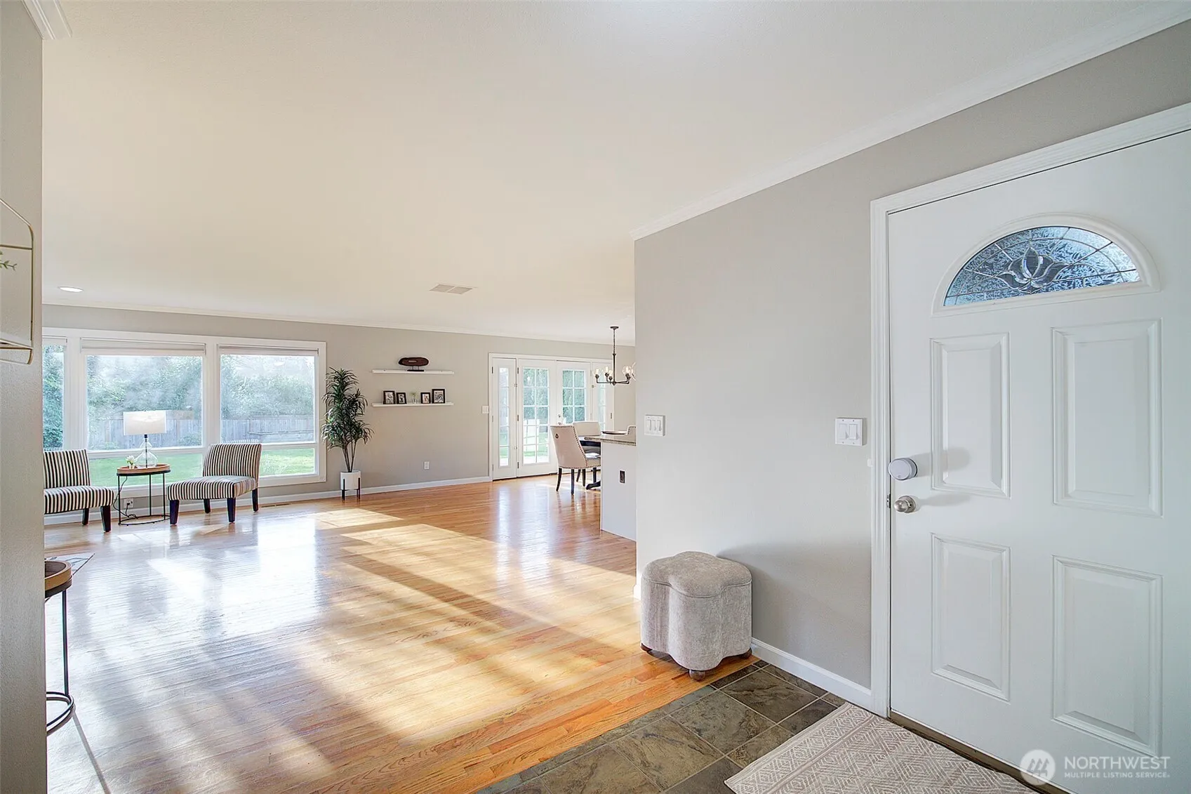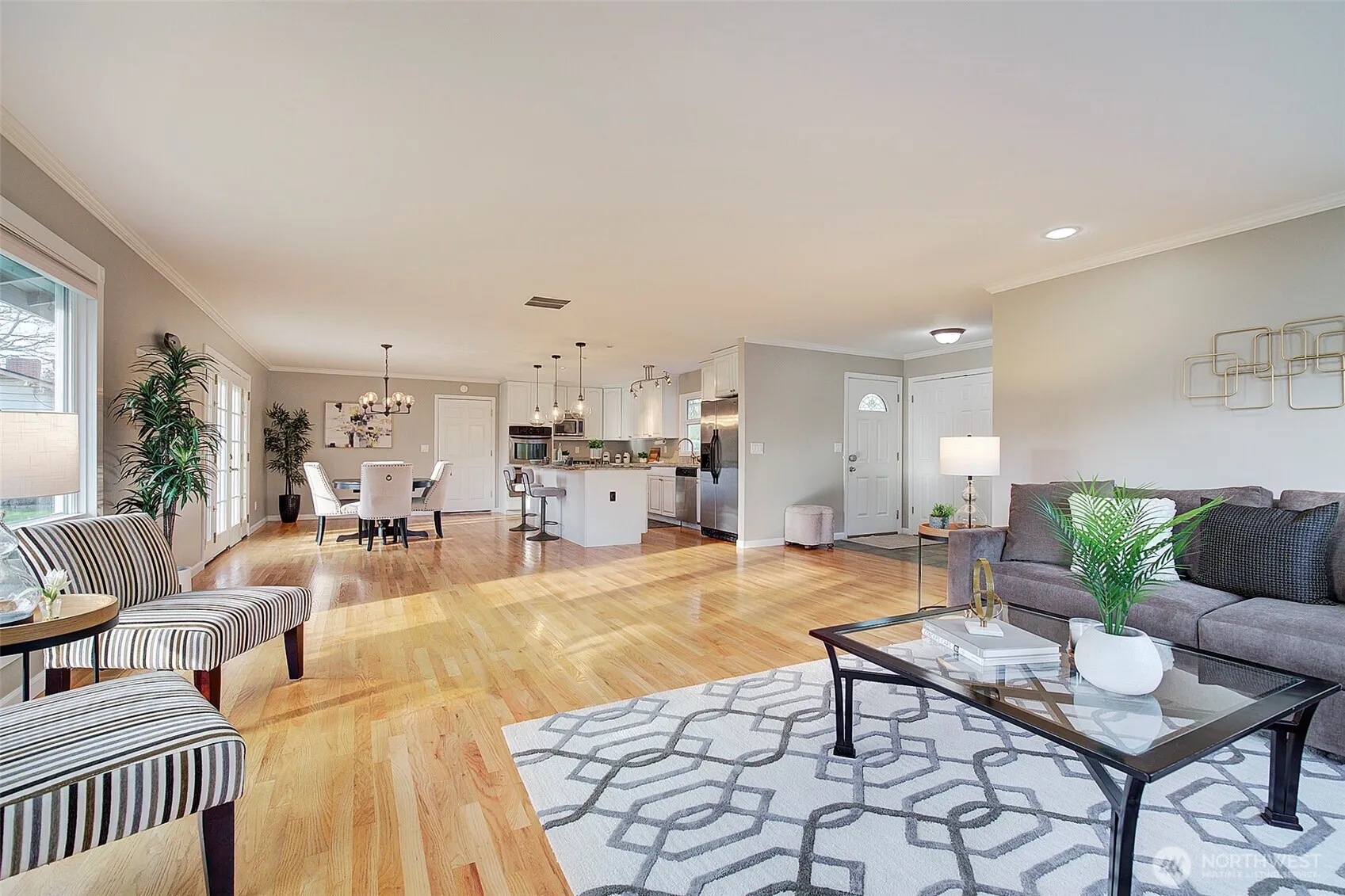 PRICE ADJUSTMENT! Beautifully updated one level home with spacious Great Room living. Lots of windows and natural light. Eye-catching oversized kitchen with huge prep island, generous counterspace & double oven. Gleaming hardwood floors throughout. Heated floors in both bathrooms. Custom closets. French doors open to large fully fenced backyard with a stamped concrete patio, shed, fruit trees and lots of room to entertain & play. Awesome backyard! Over ¼ acre homesite. Stay cool in the summer ahead with AC, installed in 2023. Northshore School District – three blocks to Inglemoor High. Just minutes to 405 freeway, vibrant Totem Lake Village, Juanita Beach and all conveniences. Pre-inspected for your peace of mind.
