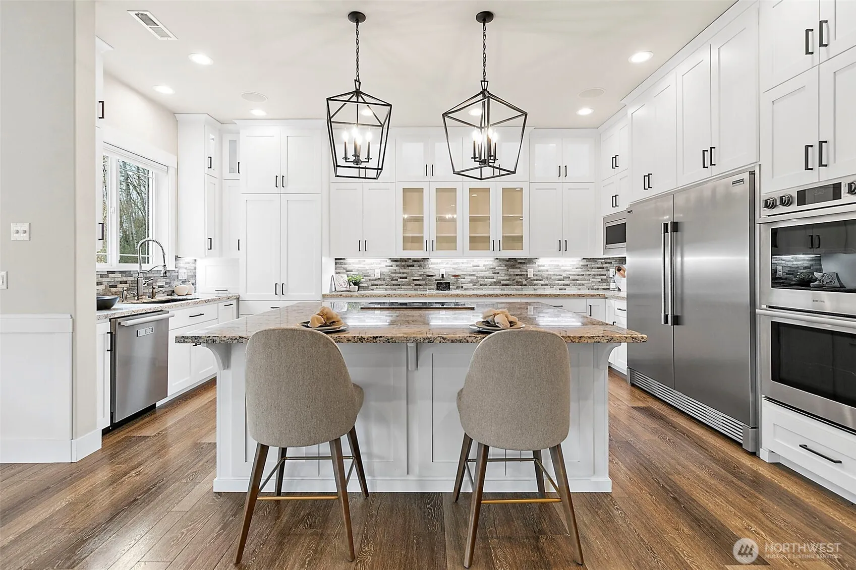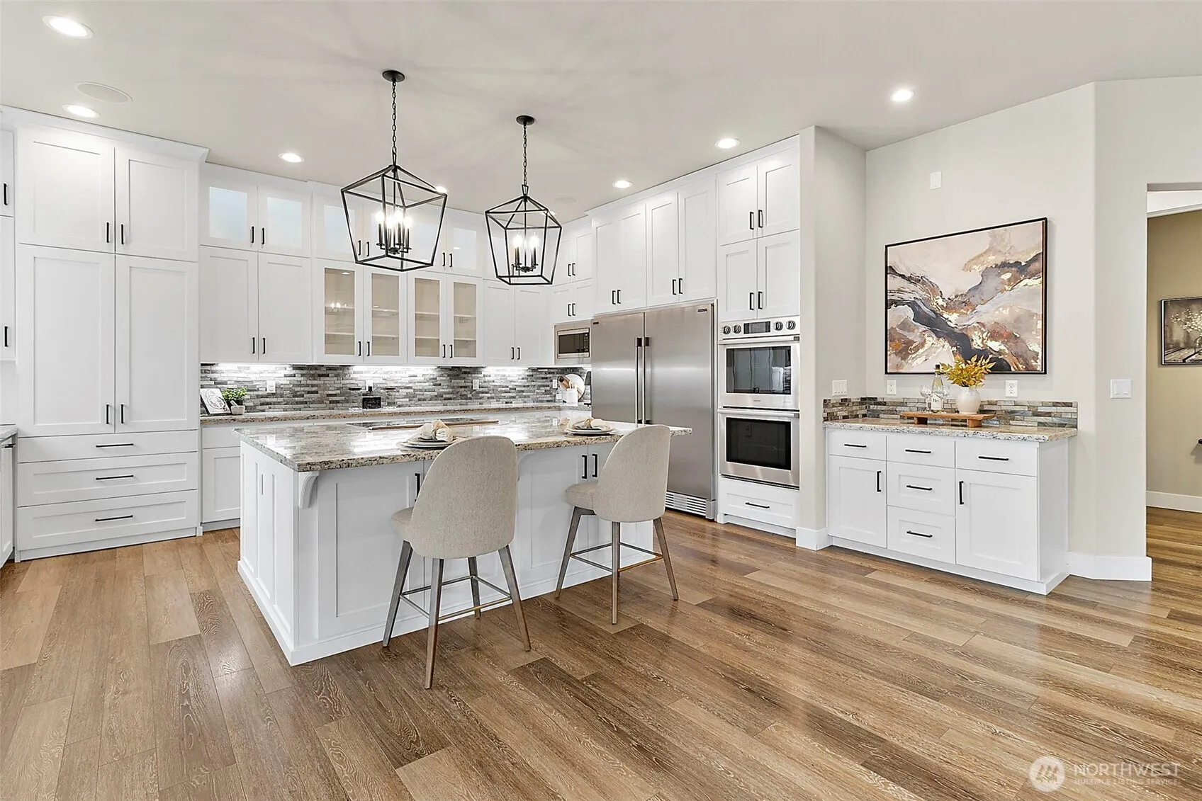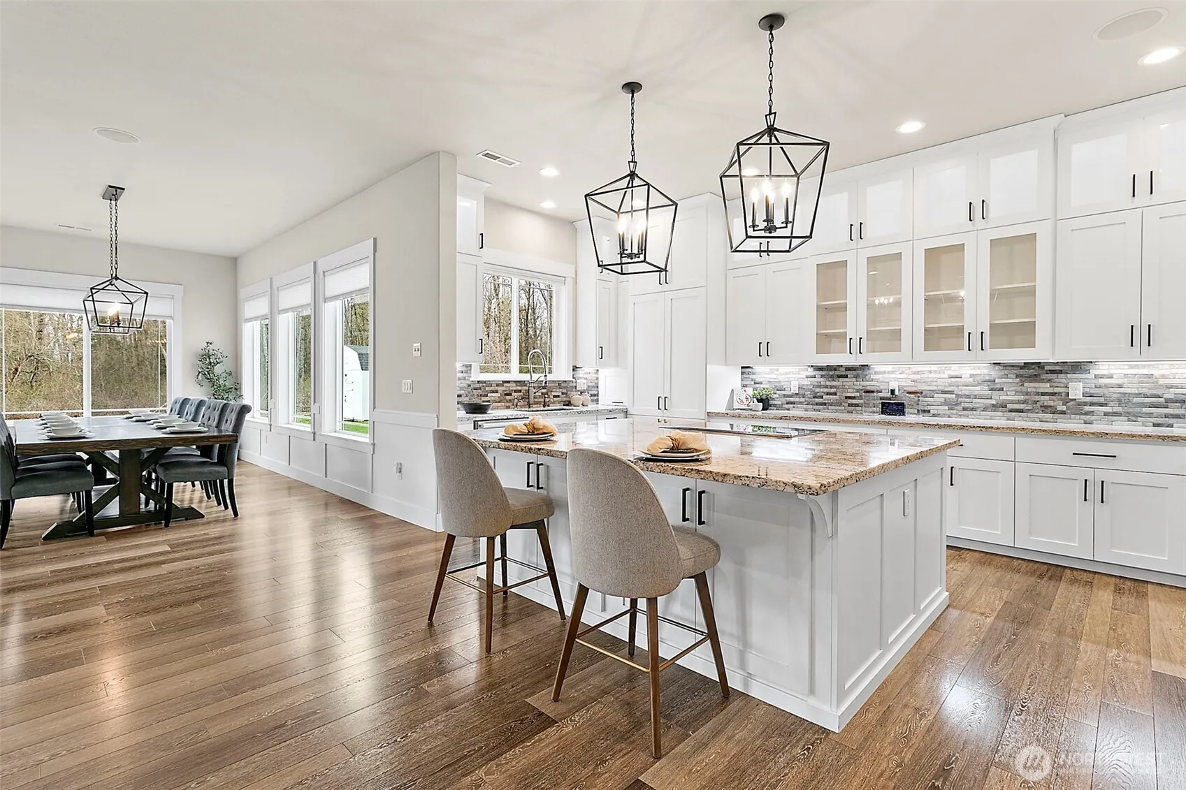 Custom built in 2019, 3,820SF, 4-bed, 2.5 bath home, on a serene forested 19.55 AC parcel w/ Mt. Rainier views! Perfectly appointed kitchen w/ granite counters, large island, double ovens, 64″ fridge/freezer combo, tons of custom cabinet storage, massive walk-in pantry & adjacent dining area big enough for 12-person seating (table & 10 chairs included). Open concept living room w/ gas fireplace insert, live edge mantle, stone surround & wall of built-ins. Huge primary bed w/ luxurious private bath that features, 3 vanities, tile floors, 2-head + rain head tile shower, free standing soaking tub, 140+SF walk in closet & walk in linen closet. Laundry room w/ cabinet storage, granite counter, mud sink + additional linen/storage. 10′ ceilings on the main w/ 9’/vaulted ceilings up. 21′ x 19′ bonus room up w/ closet storage. Whole home water filtration system, built in vac system, tankless gas HW, & built-in speakers w/volume controls. Beautiful entry w/stamped concrete covered patio & ornate metal entry doors + a huge, floor height, stamped concrete covered back patio w/ infrared heaters. Natural gas powered 16KW Generac, whole house, generator system. Turf dog run + stainless steel dog wash in the attached 4-car garage w/ drive thru bay. Grow ready raised garden beds w/nearby garden shed & playset. Property is in the City of Enumclaw Urban Reserve designation for future development potential. Country living at its finest just minutes from downtown. Truly a must-see home!