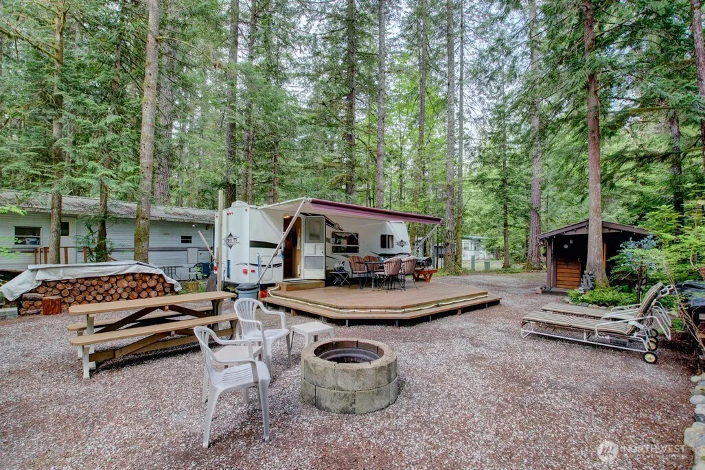 This lot is centrally located in the Glen and div 2 and gets plenty of natural light. Priced to sell so most likely will not be available very long. Great value and flexible sellers. 2006 Aerolte travel trailer, model 24RBSL (Canadian registered) included in sale if buyers are Canadian. Trailer has towing package; stabilizer bar and 3/4′ tow hitch. Sellers are happy to sell as a vacant lot to American buyer or Canadian that wants to use their own trailer. Landscaping includes 2 ornamental trees. Sale includes deck tables w/ 4 chairs, wood picnic table, chaise loungers w/ covers, a second fridge in the shed, and tv inside trailer. The Glen is zoned recreational for 120 days of use out of the year and has all the amenities you could want, including 2 pools, hot tub, pickleball courts, wooded disc golf course near the Nooksack River, library, laundry mat, 2 clubhouse, 24 hr security, gated entry, & play areas.