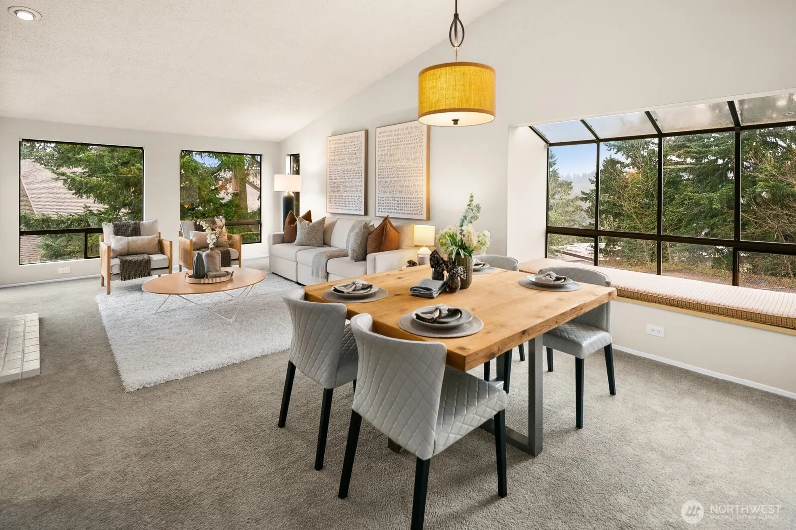 Welcome to Sunwood Condos! Rare top-floor, corner unit is move-in ready and filled with natural light. The spacious main living area features a cozy wood-burning fireplace and a built-in bar area—perfect for entertaining. A dedicated dining space includes a charming window seat that creates the ideal reading nook. Large windows throughout fill the home with natural light. The well-appointed kitchen offers generous workspace, ample storage, and a convenient pass-through to the dining area, making it easy to stay connected while cooking or hosting.The spacious primary bedroom includes a private en suite bath and great closet space. A second bedroom provides flexibility for guests, a home office, or hobby room. An additional full bath and laundry closet with extra storage are conveniently located in the hallway.Step outside to your private balcony—perfect for relaxing on warm summer evenings. The unit includes one reserved covered parking space plus plenty of visitor parking. Well-managed HOA with great amenities including a pool, hot tub, tennis courts, and clubhouse. Fantastic location just minutes from Westfield Southcenter Mall, dining, shopping, SeaTac airport and major commuter routes.