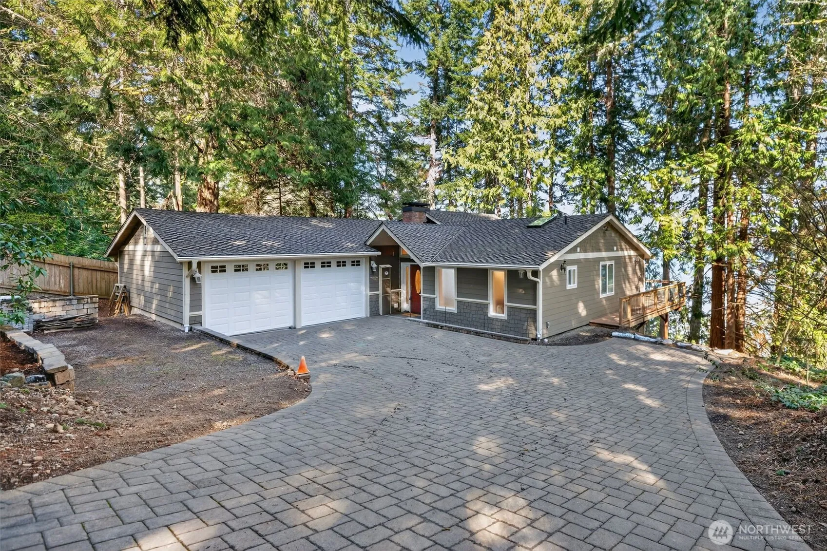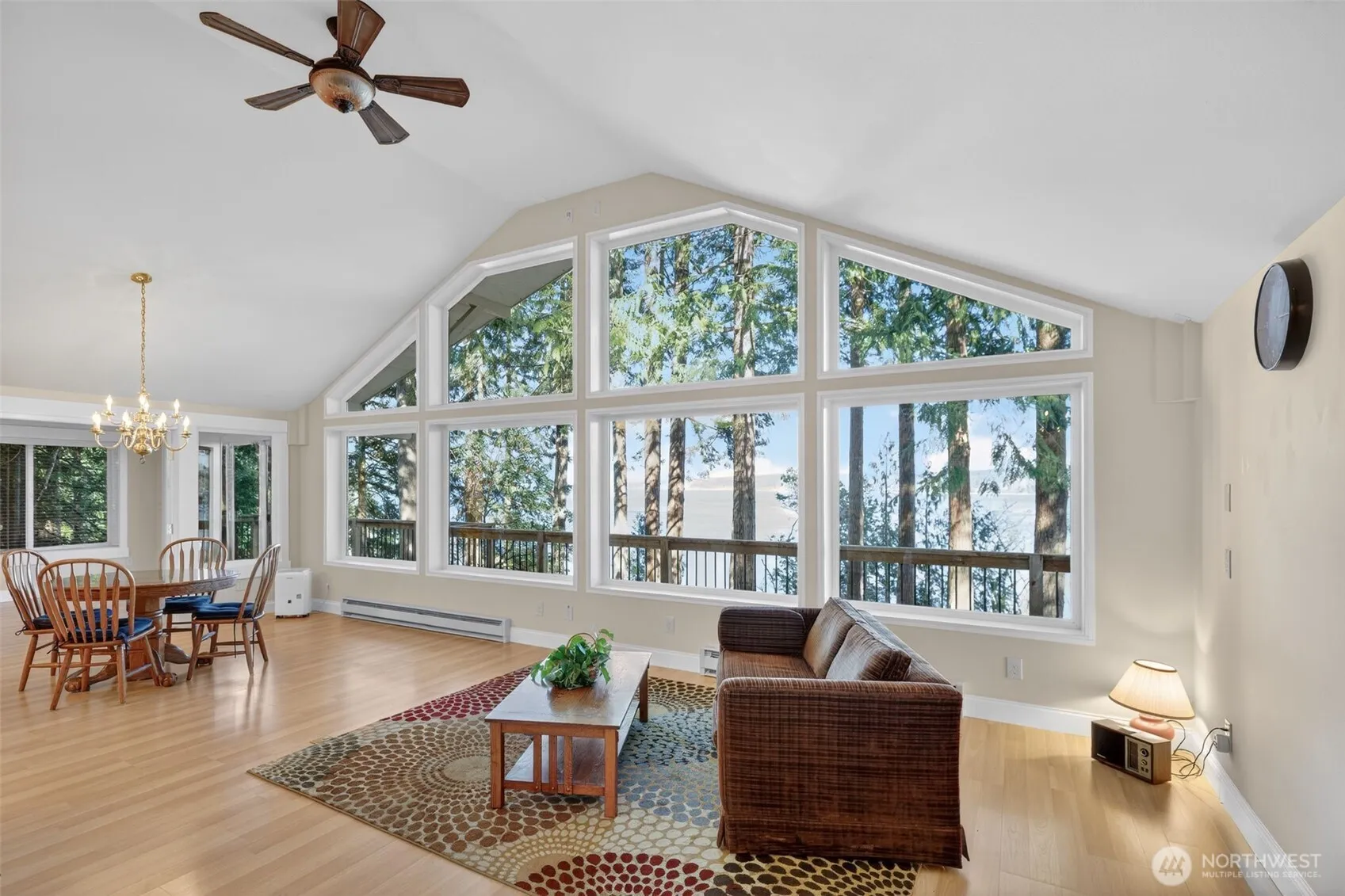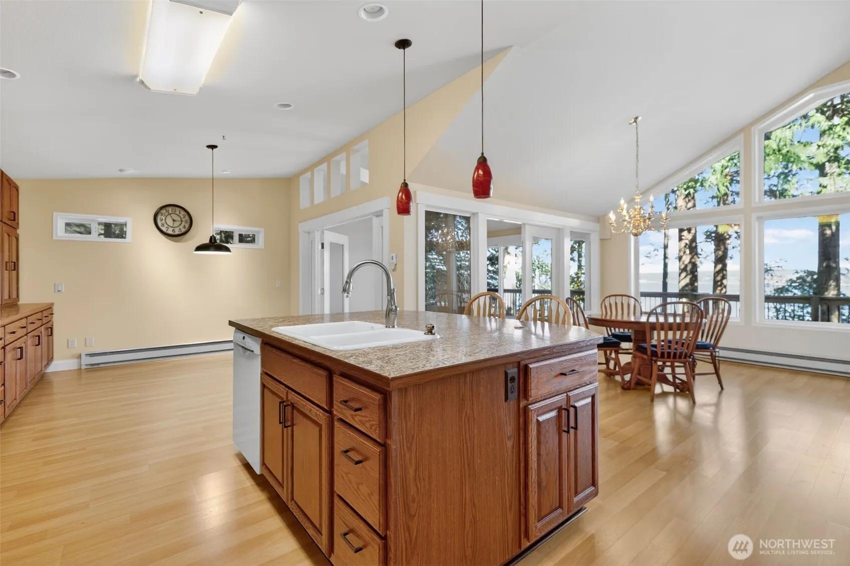 VIEWS and Waterfront Living! Vaulted ceilings and a dramatic wall of windows fill the living area with natural light and provide sweeping Sound views. Living and dining areas flow seamlessly, anchored by two wood-burning fireplace inserts. (Good supply of firewood stays!) Multiple double doors extend the living space and give access to the full-length deck overlooking the water. Kitchen is both functional and beautiful, featuring abundant custom wood cabinetry offering ample storage and display workspace and water view. Adjacent dining area enjoys its own access to the deck, making indoor/outdoor dining easy. Primary suite is positioned to capture the view, with a slider to the deck overlooking the water, massive closets, and en-suite bath features heated floors, double vanity. True waterfront living is enhanced by a rare, grandfathered-in private dock that provides direct access and long-term value. BRAND NEW 4-Bedroom Septic System!
