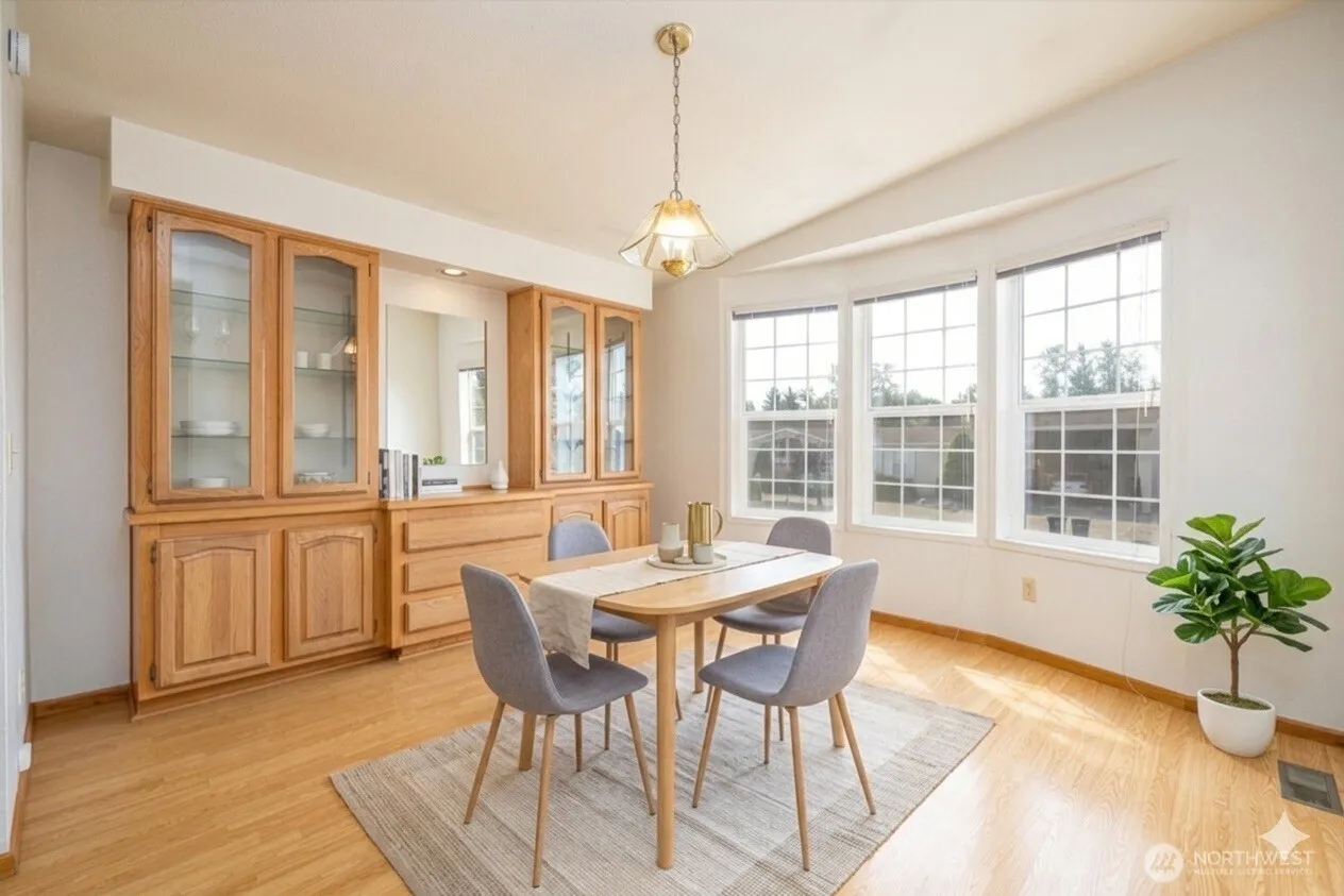 Come experience modern living in the highly sought-after 55+ community of James Street Estates, where this spacious 1,546-square-foot residence offers a perfect blend of sophistication and comfort. I am thrilled to present this meticulously maintained three-bedroom, two-bathroom home featuring an inviting open-concept layout accentuated by soaring vaulted ceilings and abundant natural light. The heart of the home is a stylishly updated kitchen equipped with sleek stainless steel appliances and extensive cabinetry, flowing seamlessly into a generous dining area complete with a refined built-in hutch for all your hosting needs. Retreat to the primary suite, a private sanctuary boasting a large closet and an elegant en suite bath designed for relaxation. Outside, the sunny back patio serves as an ideal spot for morning coffee among the established garden beds and lush lawn. Practicality meets convenience with a two-car carport that includes a dedicated bonus room for additional storage or hobby space. Situated on a beautifully situated lot according to Whatcom County records, this property offers a low-maintenance lifestyle with an HOA that covers water, sewer, garbage, and cable. Residents also enjoy exclusive access to the community clubhouse, manicured common spaces, and convenient RV storage. This is a rare opportunity to secure a refined, turn-key residence in one of Bellingham’s most welcoming environments.