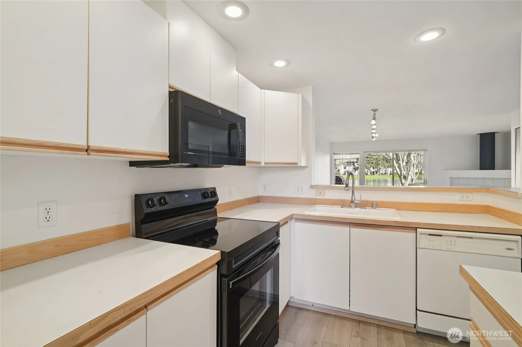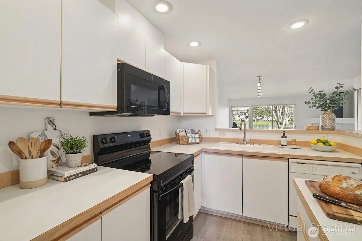 Highly desirable lake-edge 2-bedroom, 2.25-bath townhome featuring bright, open living spaces with both bedrooms on the upper level—each with its own private bathroom for added comfort and convenience. The east-facing bedroom showcases stunning water views, while both bedrooms offer ample closet space; one bath includes a tub and the other a shower. Either bedroom can easily be converted into a spacious home office. The kitchen, complete with a breakfast bar and adjacent dining area, flows seamlessly into the inviting living room with a cozy wood-burning fireplace. Step outside to a large deck overlooking the lake—perfect for morning coffee or entertaining with BBQs—surrounded by mature vegetation for added privacy. Additional highlights include a private detached garage with bonus overhead storage, an assigned parking space, and plenty of guest parking. Ideally located near major aerospace employers, Amazon distribution centers, and Kent Station, with easy access to shopping, freeways, and scenic trails. This townhome offers the perfect blend of comfort, convenience, and lakeside tranquility in a fantastic location.