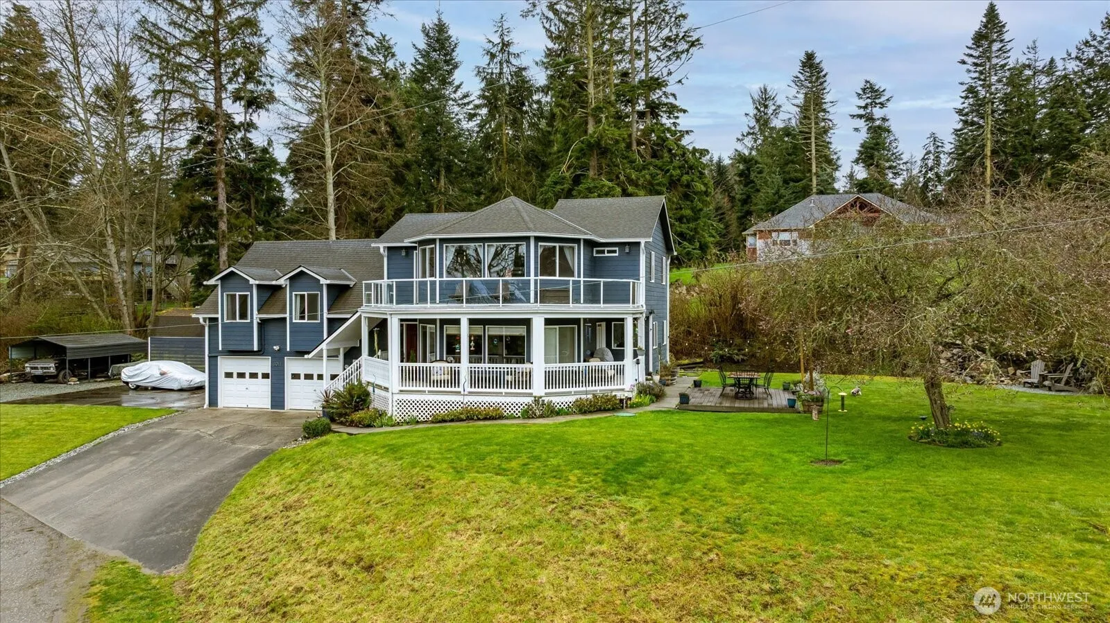 Enjoy sweeping views of Puget Sound and the San Juan Islands from the spacious primary suite with a private deck—perfect for year-round sunsets. This well-designed home offers multiple living spaces, including a mid-level family room with a pellet stove, 2 bedrooms, a den, an office, a full bath, and a convenient laundry. The main level features a large eat-in kitchen, formal dining with skylights and vaulted ceilings, and a bright living room filled with natural light and panoramic views. Thoughtfully updated throughout with a newer roof, rebuilt upper deck with aluminum/glass railing, updated kitchen with granite counters, custom backsplash, raised ceiling with LED lighting, and stainless steel appliances. Renovated the primary bath, plus added a walk-in closet. Additional upgrades include whole-house water filtration, french drain, LeafGuard gutters, newer flooring, interior paint, and updated shop space. The lower level includes a garage, ample storage, and a shop area. Rare opportunity just one block from the beach with nearby trails—walk to the beach in minutes in a sought-after location.