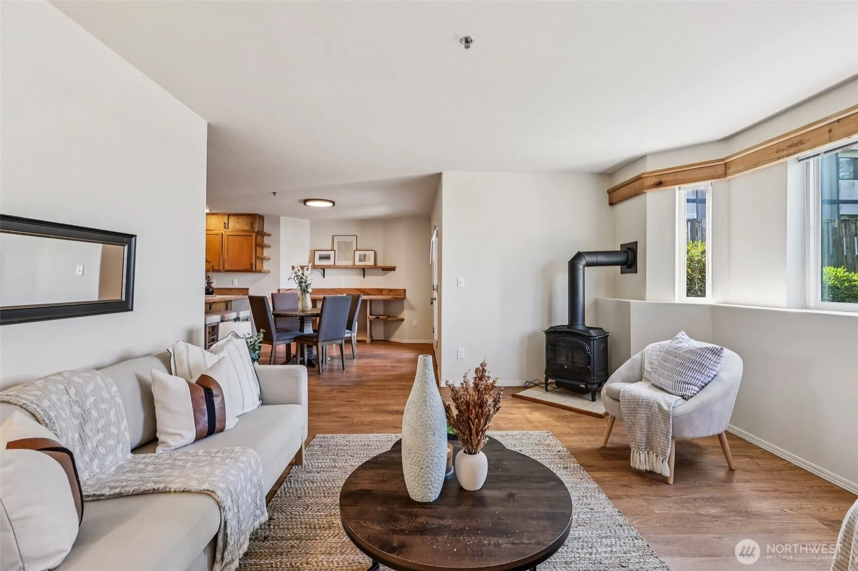 Savor sunsets over Skagit Bay and the Olympic Mountains from this inviting single-level, end-unit condo nestled in the peaceful, friendly community of Stanwood Ridge! A rare ground-floor retreat with ZERO stairs, private patio, & reserved parking just steps from your door. Inside, modern, meticulous updates blend with warmth, with no surface untouched: custom Alder finishes, refreshed cabinets, fresh paint, new plumbing fixtures & new lighting create a polished, move-in ready space. Enjoy cozy evenings by the gas fireplace, mornings in the open kitchen, & a pet-friendly community that feels like home. New washer/dryer & portable A/C included! Just minutes from charming downtown Stanwood, this condo is both a sanctuary & a smart investment.