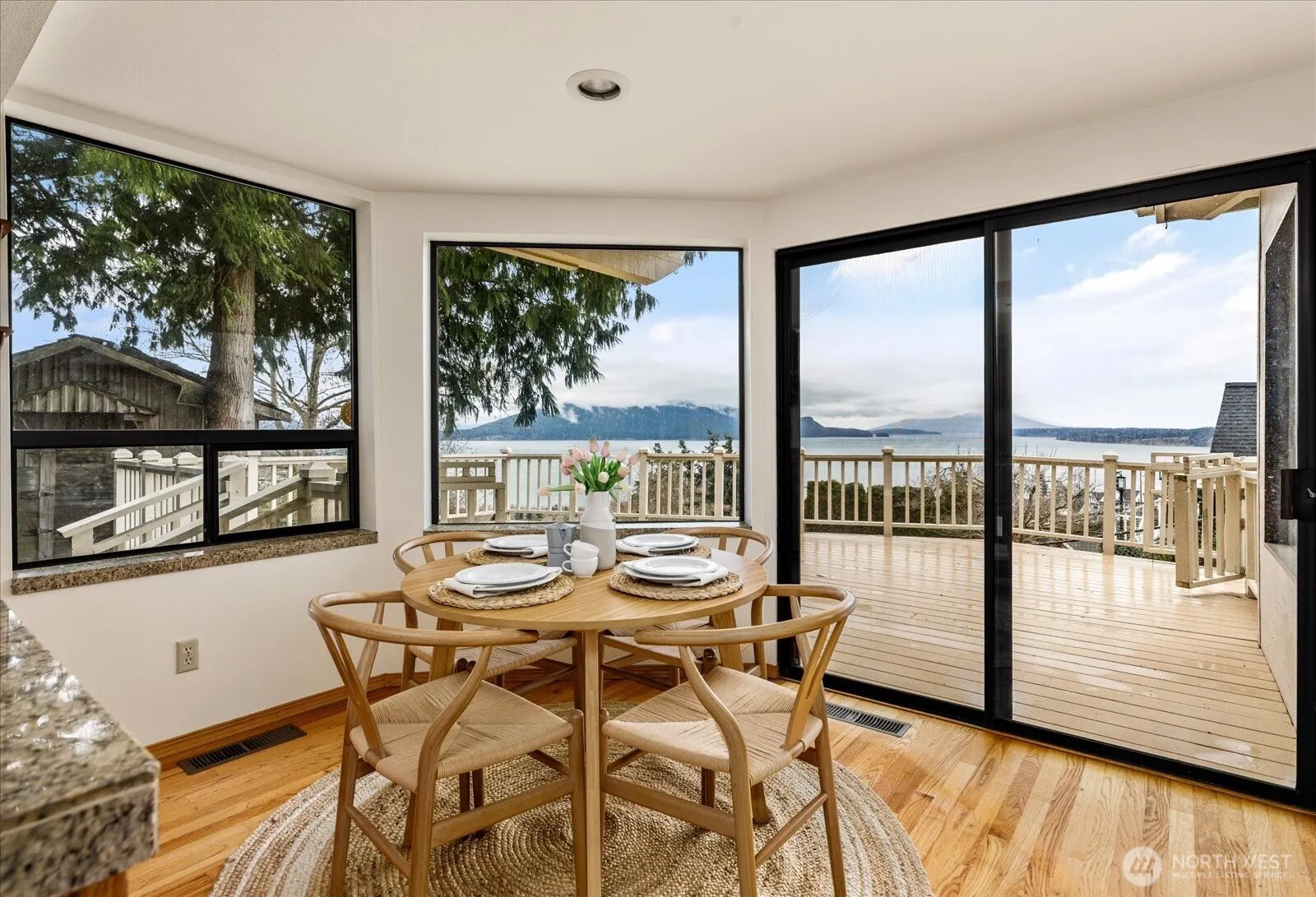 Enjoy stunning bay views and unforgettable sunsets from this beautifully situated Clearidge home in coveted Anacortes. Watch the ferry glide across the water from multiple vantage points, including the primary suite’s private balcony and expansive deck designed for outdoor living. Vaulted ceilings create an airy feel, while the kitchen and eating nook overlook ever-changing water and island scenery. An enclosed sunroom offers year-round enjoyment. The spacious primary suite feels like a retreat, complete with full bath, walk-in closet, and private balcony overlooking the bay. Two additional bedrooms and a full bath complete the upper level. Step outside to a fully fenced backyard oasis featuring a large deck, lush landscaping, and privacy – perfect for entertaining or quiet relaxation. Additional highlights include a new roof, fresh interior paint, oversized three-car garage, and extra parking area. A rare blend of comfort, coastal charm, and breathtaking views in one of Anacortes’ most desirable neighborhoods.