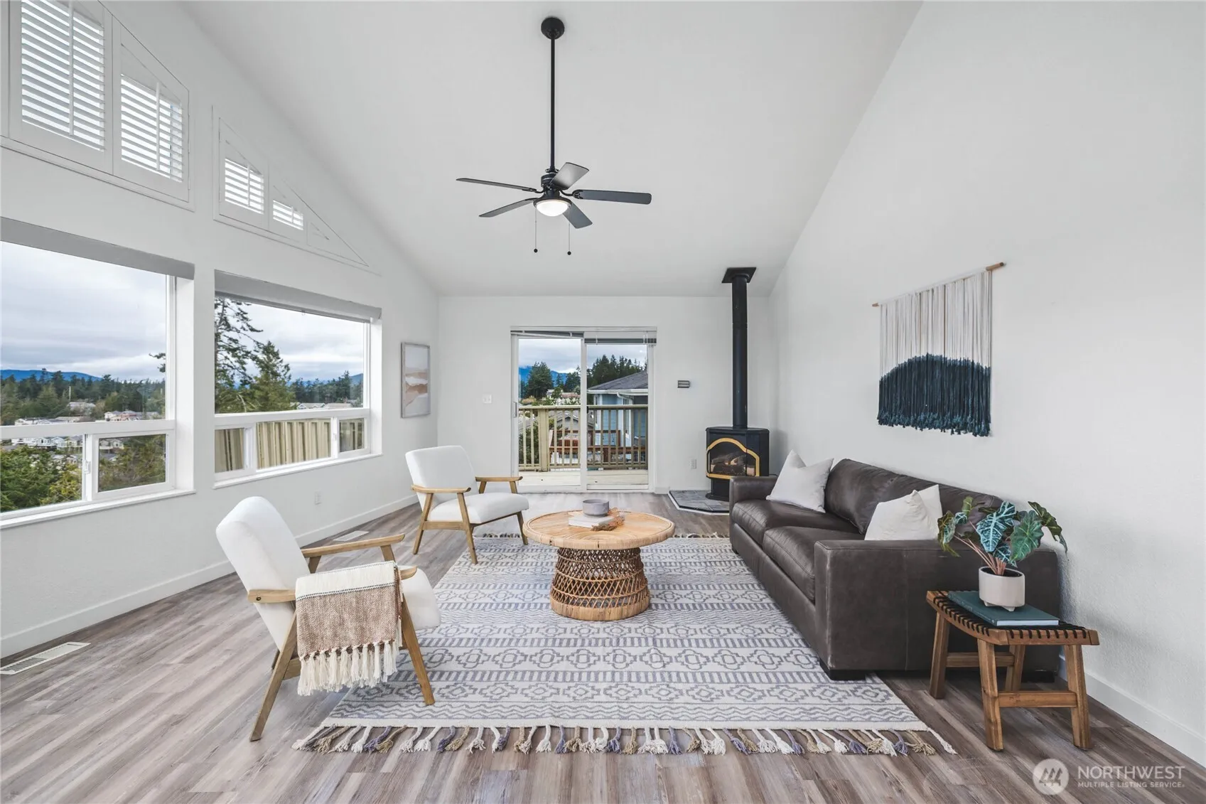 Enjoy commanding views of Burrows Bay, the San Juan Islands, Olympic mountains, and beyond from this towering Anacortes home. The main level offers true everyday convenience with an open-concept layout, vaulted ceilings, hardwood-laminate flooring throughout, and a free-standing gas stove. The kitchen features new quartz countertops and new appliances, and the interior has been freshly painted. The primary bedroom with ensuite bath is also on the main level for easy living. Lower levels include additional bedrooms, updated bathrooms with new vanities, and a flexible bonus area suitable for media, office, or hobbies. A separate-entrance guest suite provides excellent options for visitors or multi-generational living. Multi-level decks extend the living space outdoors, making the most of the sweeping views. A double-car garage adds practical storage and parking. This home combines functional updates with a layout that supports a variety of lifestyles in a desirable Anacortes location. Skyline amenities include clubhouse, beaches, parks and marina.
