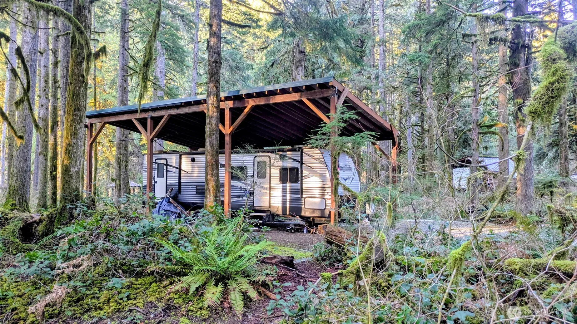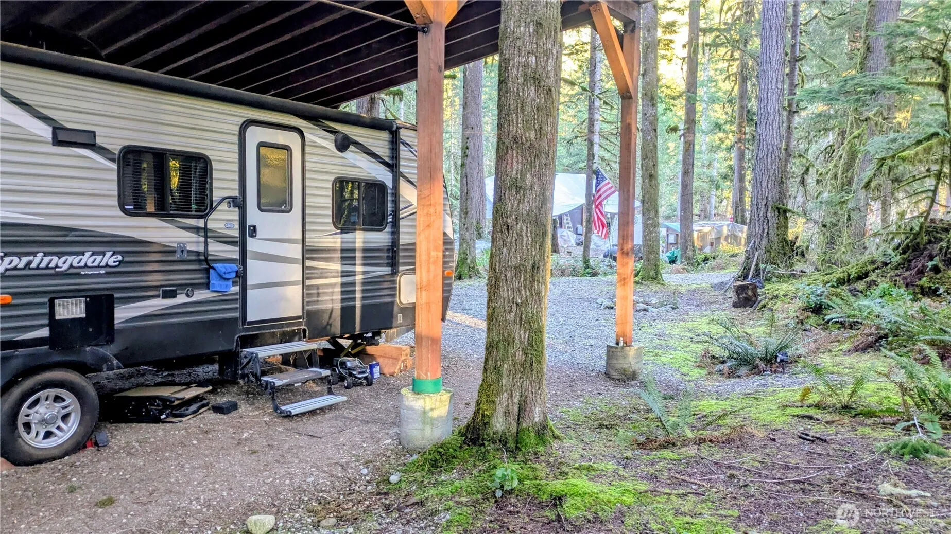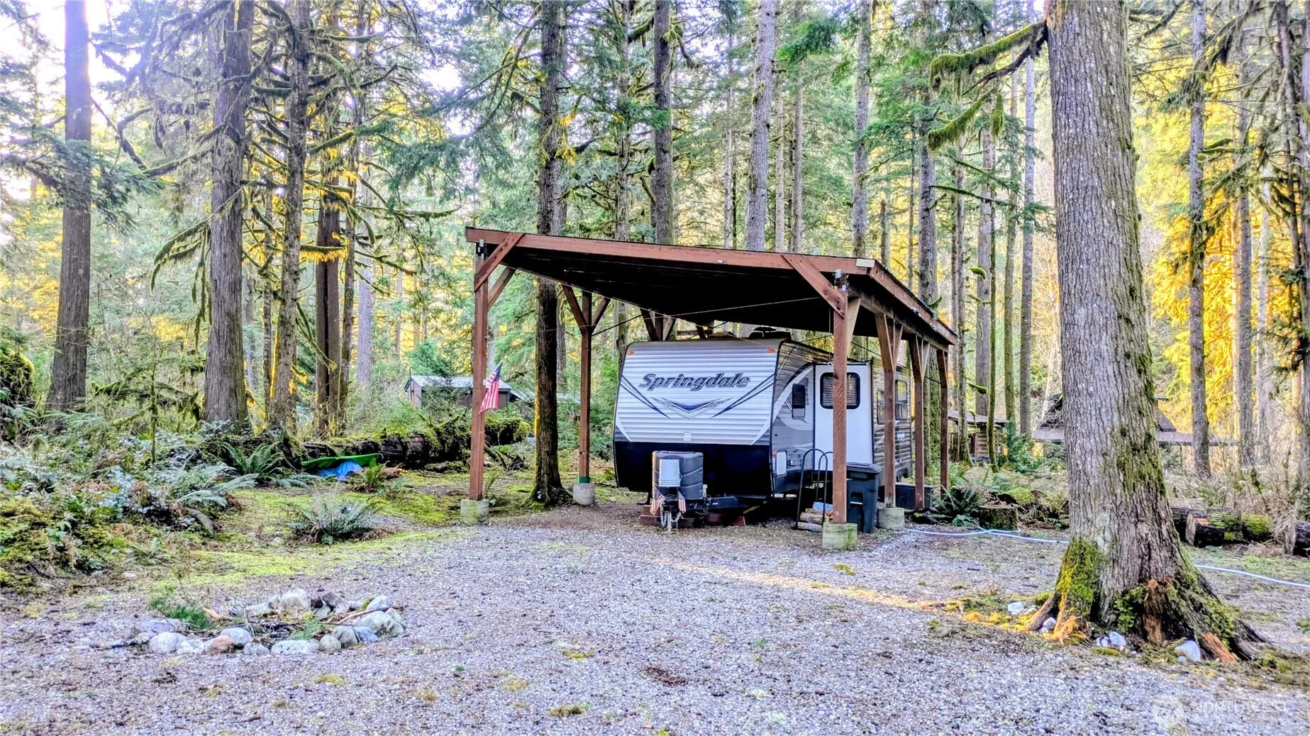 PRICE DROP! CHECK IT OUT! Prime DOUBLE LOT (.48 acres) with large, pitched 20′ wide x 40′ long metal roof cover. The high side is 16′ down to the 12′ end protecting the Arctic packaged 2017 37′ Keystone (Springdale Model) travel trailer. There’s one slide- out & sleeps 10. New in 2025: stereo/dvd player, hot water heater, thermostat with air conditioning, and microwave. The oven has never been used. Trailer is very clean, well-maintained and turn-key. You’ll make out like a bandit on this one; seller will leave generator for you. Batteries are brand new! ($600 value) Extra (150′) drinking hoses, must-have tools, and CAMCO RHINO HD 28-gallon portable RV waste holding tank with hoses and all accessories with gauge. Directly across the street from the Cascade River, it’s perfect for relaxing, fishing, hiking, enjoying nature and just the perfect vacation spot to get away from the hustle and bustle of life. Community park, heated bathroom and beach are conveniently located down the street about 100 yards away. There’s so much room for guests, tents/trailers, and firepit gatherings. Whether you are looking for your vacation retreat or year-round living, you have found it here in the foothills of the Cascades. Stunning!