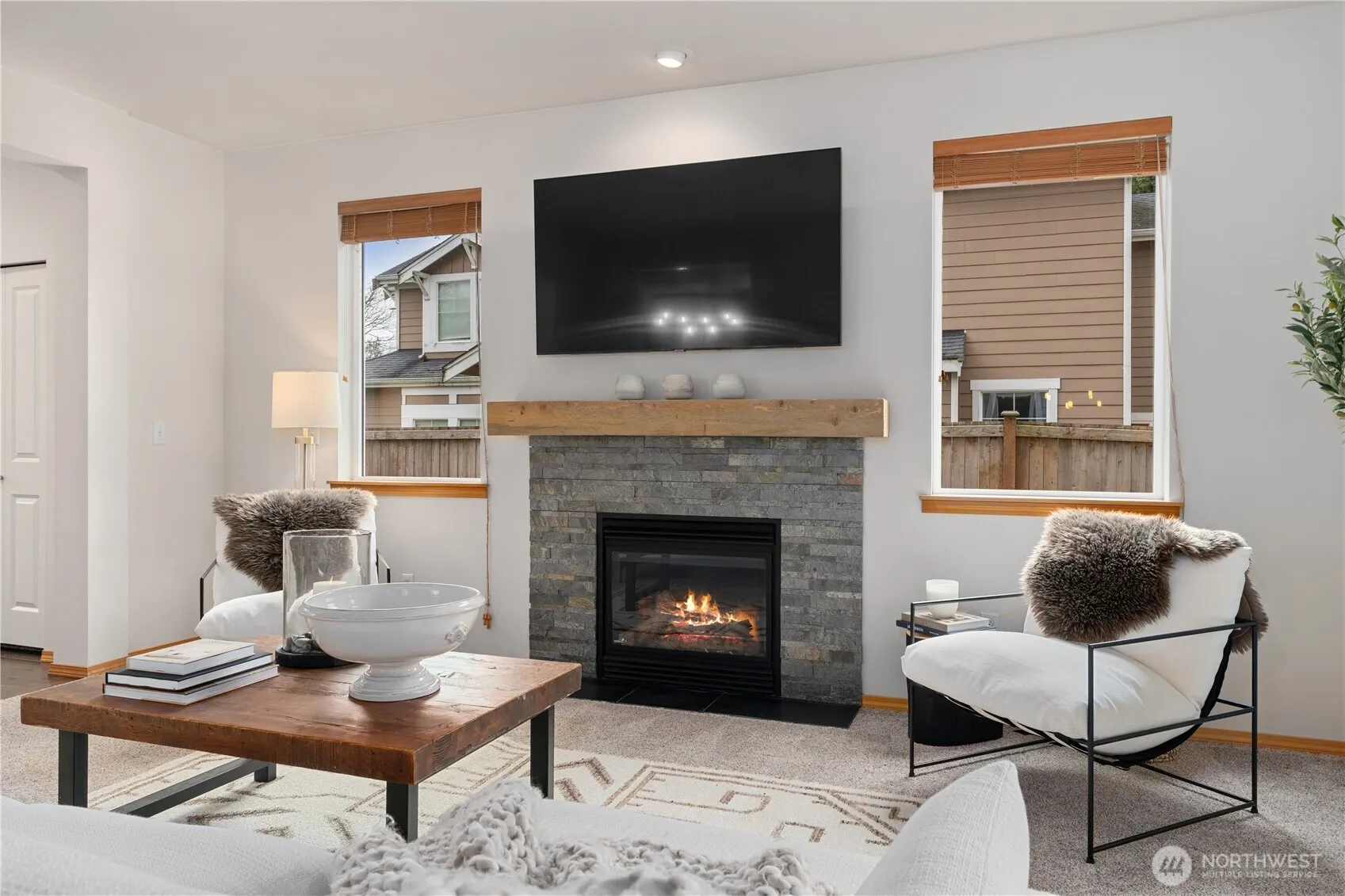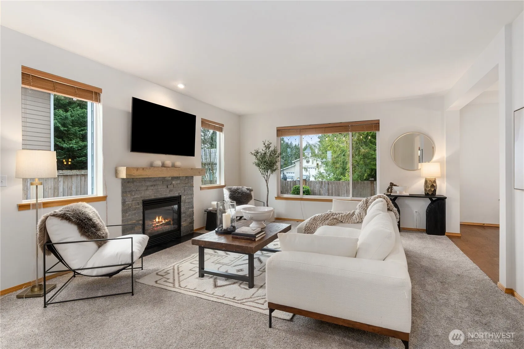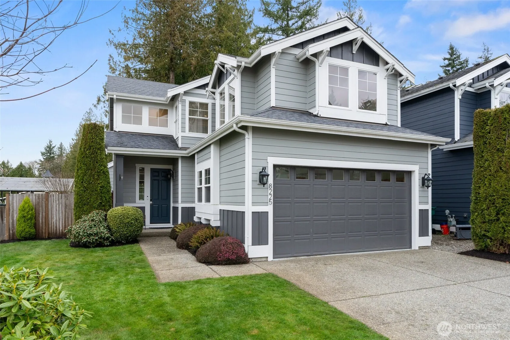 Exceptionally maintained 4 bed, 2.5 bath home offering more than 2,200 sqft in a well established neighborhood known for its charm, mature landscaping, and welcoming community feel. Set on a private greenbelt lot, the property enjoys a peaceful natural backdrop with added peekaboo Olympic and Sound views, creating beautiful sunset moments while still being close to everyday conveniences. Inside, the home features engineered hardwood floors, fresh interior paint, updated lighting, newer carpeting, and new light fixtures throughout. The spacious kitchen is designed for both daily living and entertaining, showcasing a large center granite island with bar seating, generous counter space, tall cabinetry, stainless steel appliances, and warm, rich finishes. The open great room layout flows seamlessly into the dining and living areas with tall ceilings, centered around a cozy fireplace with custom mantel and a dramatic wall of windows framing lush greenbelt views. Upstairs, the primary suite offers a relaxing retreat with serene tree lined outlooks, custom built in closet design, and a luxurious 5 piece bath with dual sinks, soaking tub, shower, and walk in closet. Three additional bedrooms are generously sized, offering flexibility for guests, office space, or hobbies. The guest bath has been recently updated with new cabinetry, countertops, and modern lighting. Covered front and back porches, fenced backyard, patio + newer exterior paint. [WELCOME HOME]