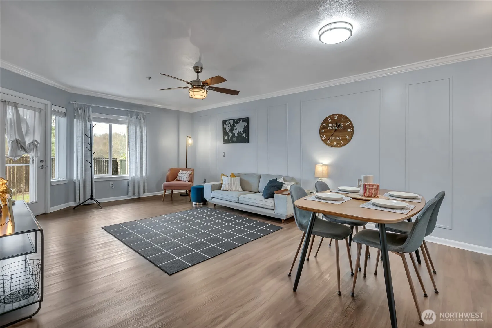 Welcome to The Peaks! This pre-inspected first-floor end unit condo features an open, light-filled layout with beautiful laminate flooring, crown molding, and a clean, modern feel throughout. The spacious kitchen offers quartz countertops, newer stainless steel appliances, ample cabinetry, a high-top breakfast bar, and space for a dining table. The kitchen opens to a large living area with direct access to your fenced, covered patio with private garden/green space. The primary suite is generously sized with multiple closets, a double-sink vanity and ¾ en suite bath, and its own access to the patio. A second bedroom and full guest bathroom offer flexibility for guests or a home office. Additional highlights include secure building entry, two covered parking spaces in the common garage, in-unit full-size washer and dryer, and low HOA dues covering water, sewer, garbage, and yard maintenance. No rental cap and a prime commuter location with easy access to Seattle, Bellevue, SeaTac Airport, and nearby shopping and dining.