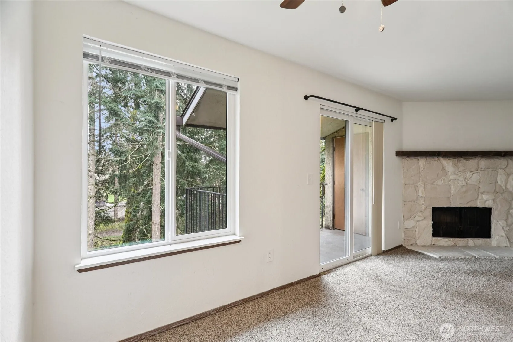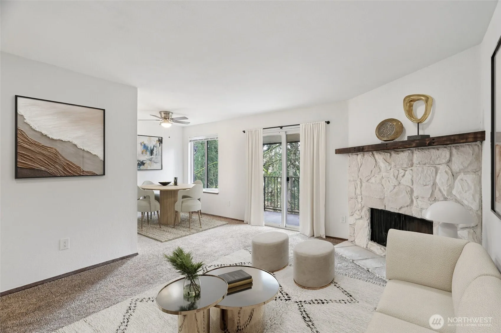 Highly desirable top-floor corner unit in Olympic Skyline Condominiums! This inviting 1-bedroom, 1-bath home features a serene covered balcony overlooking lush, park-like grounds and a peaceful creek—perfect for relaxing mornings or evenings. The spacious living and dining areas feature a cozy fireplace, while brand-new carpet throughout adds a fresh, move-in-ready feel. The kitchen comes fully equipped, including a new range; all appliances are included. Enjoy the convenience of one assigned parking space plus ample guest parking. Ideally located just minutes from shopping, dining, Hwy 167, and Sound Transit, this home offers both comfort and accessibility.