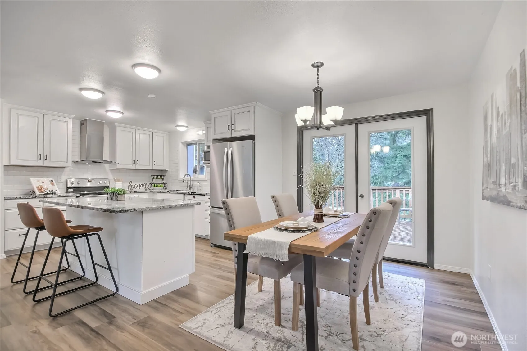 Welcome to this beautifully remodeled residence, nestled in a peaceful Lake Tapps setting, surrounded by mature evergreens and natural privacy, just steps from the lake! This spacious 4-bedroom, 2.5-bath home features a modern, open kitchen with quartz countertops and white cabinetry, flowing into the dining area and light-filled living space—perfect for optimal living and entertaining. Fresh, modern finishes throughout create a clean, move-in-ready feel. Step outside to an expansive deck overlooking the private backyard, ideal for gatherings, quiet mornings, or relaxing evenings by the fire pit. The lower level features a generous and functional bonus area and a dedicated mudroom, offering flexible space for work, play, or additional living. The generous lot includes an additional outbuilding for storage or hobbies.Enjoy exclusive, private access to gated Jenks Park, featuring a private beach, boat launch, playground, and tennis and basketball courts—bringing the best of Lake Tapps living right to your doorstep. Conveniently located near additional parks, shopping, dining, and commuter routes. Nestled within the highly regarded Sumner-Bonney Lake School District. A perfect blend of comfort, privacy, and lifestyle in one of Lake Tapps’ most desirable settings.