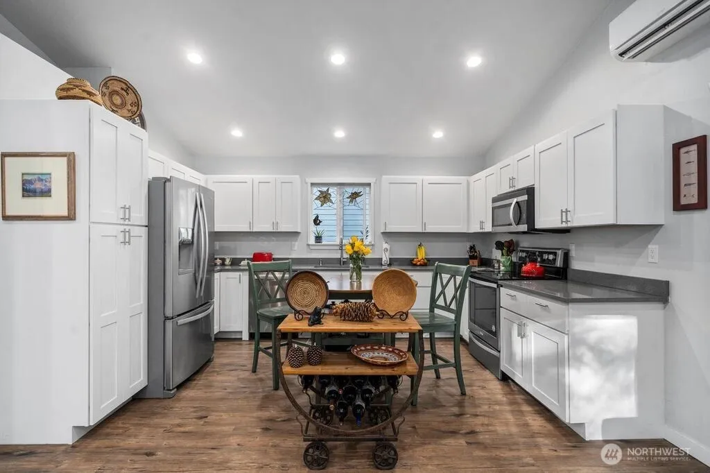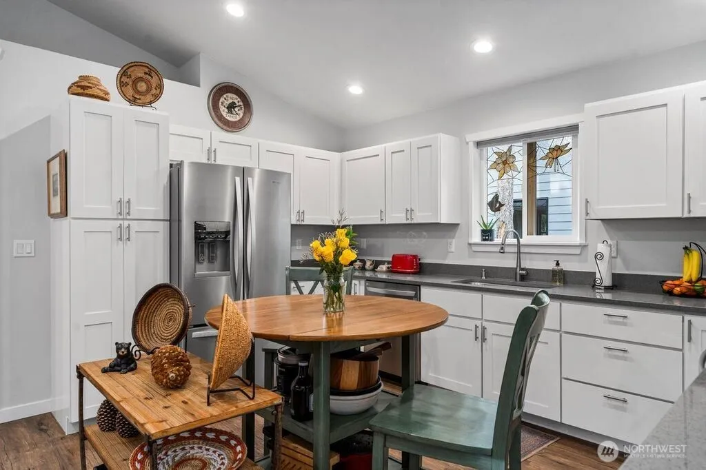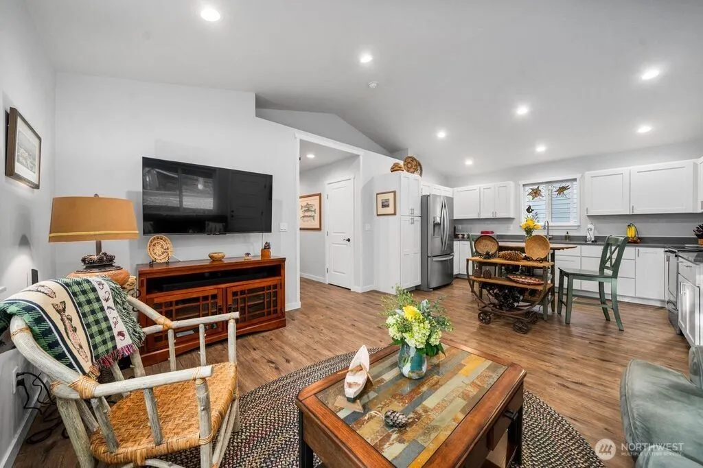 The Perfect Canvas to a Retreat Lifestyle. Newly Built in 2020, No Details were spared in this impeccably styled modern retreat house, tucked away in a peaceful Northwest setting. This home is just a stone’s throw to the tranquil waters of Clear Lake, the community pool & miles of nature walking trails ~ the Clearwood gated community is just minutes from downtown Yelm. Boating/kayak launches, hiking trails and forest preserves around! This sophisticated property is designed for calmness, appreciation of nature & ease of living. This luxurious single story estate has a fluid layout throughout for maximum accessibility, indoor & outdoor flow, comfort and serenity. Upon entering the private half moon gravel driveway, you will be greeted by a sense of peace and relaxation. Enter the house & enjoy vaulted cathedral ceilings drenched with natural light, and LVP wide planked flooring that create a warm, inviting ambiance, perfect for entertaining all year around. The open floor plan co-mingles the outfitted kitchen with quartz countertops, a floating island dining area, bright and airy great room. Summertime enjoy the portico that fits an oversized table for large parties & entertaining. Wintertime doubles as a carport. Two bedrooms & baths offer character, a departure from traditional cookie-cutter homes. The primary bedroom, an en-suite bathroom with walk-in shower, large walk-in closet has a private deck and entrance. Naturally, the landscaped backyard is fully~fenced & divine.