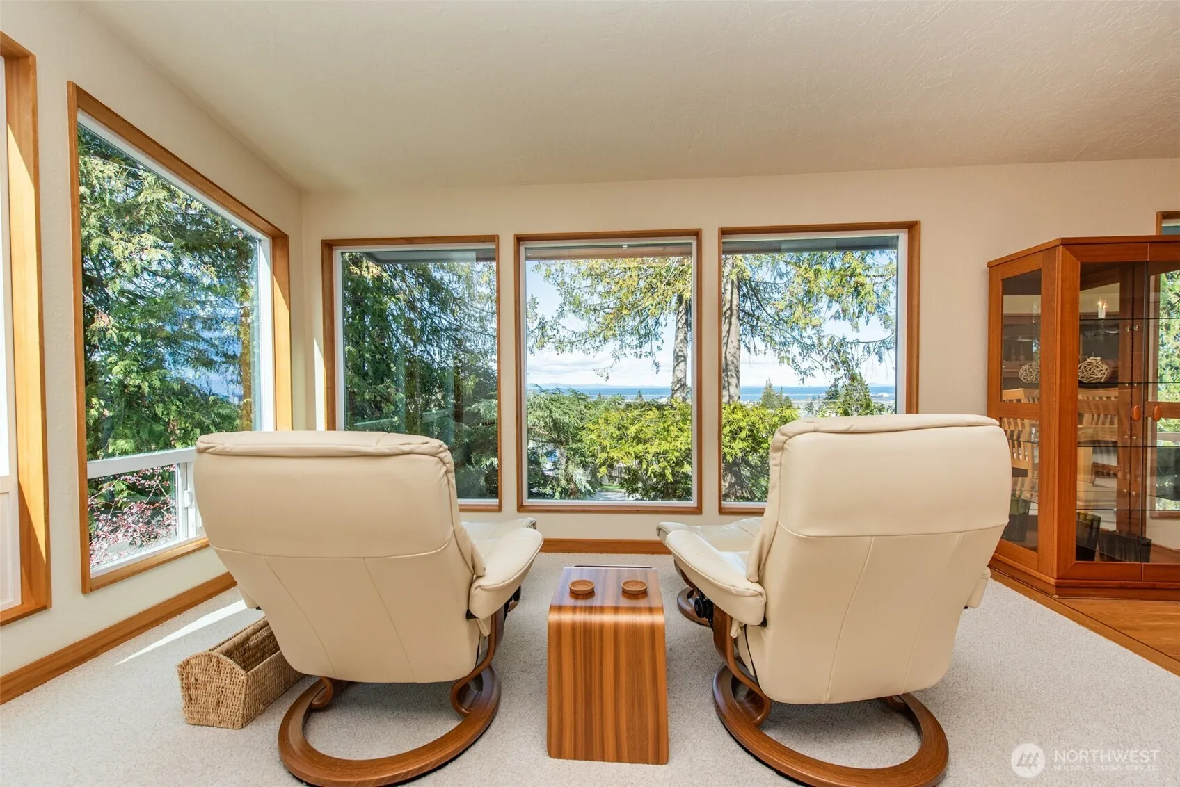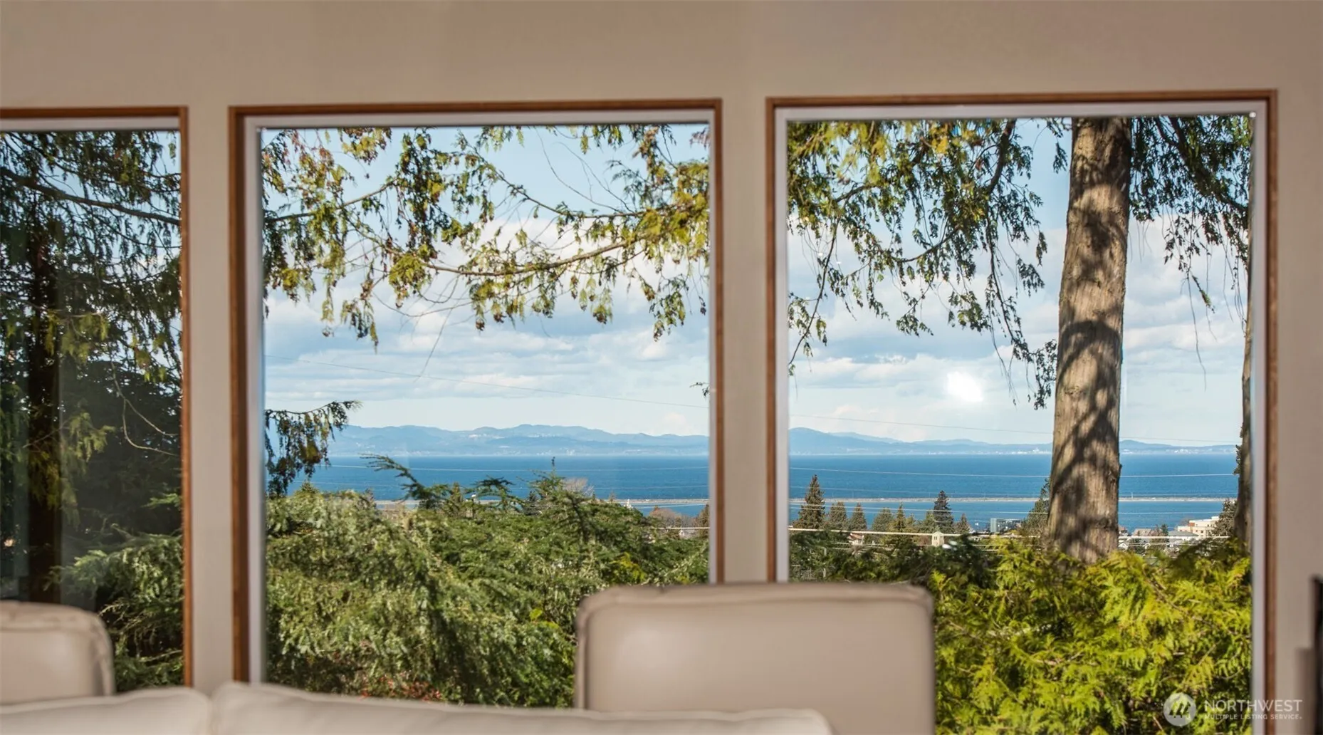 This stunning home showcases a tastefully executed remodel that preserves the home’s contemporary feel while highlighting its unique architectural character with exposed beams and clerestory windows. Nearly every surface has been refreshed within the past three years, including new siding and exterior paint, new roof, new windows, and new gutters. The interior shines with hand-blown glass light fixtures, new interior doors, new carpet upstairs, new hemlock interior trim throughout, fresh paint, and a beautiful blend of red and white oak flooring. The bathrooms have been fully updated with elegant tile work and modern fixtures. Designed with entertaining in mind, the home features a spacious living room, formal dining room, and a welcoming family room with a cozy propane fireplace. Offering four bedrooms plus a dedicated office and 2.5 baths, there is ample space for both relaxation and flexibility. Outside, approximately $150,000 has been invested in professionally designed landscaping, including a new paver patio, stamped concrete portico, and a newly poured concrete driveway. The easy-maintenance grounds are accented by beautiful, mature cedar trees, and the property is perfectly positioned to capture serene views of the Strait.