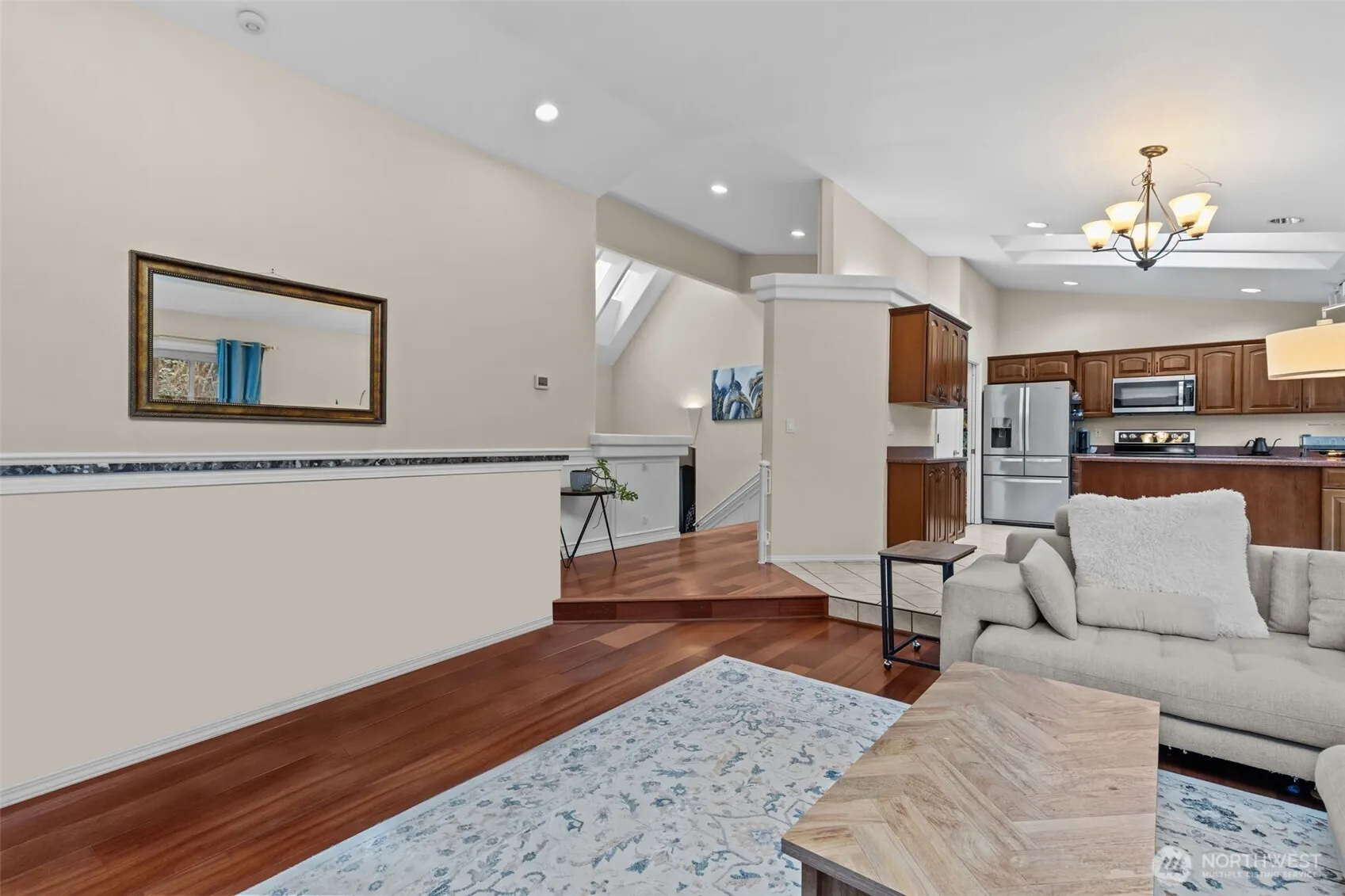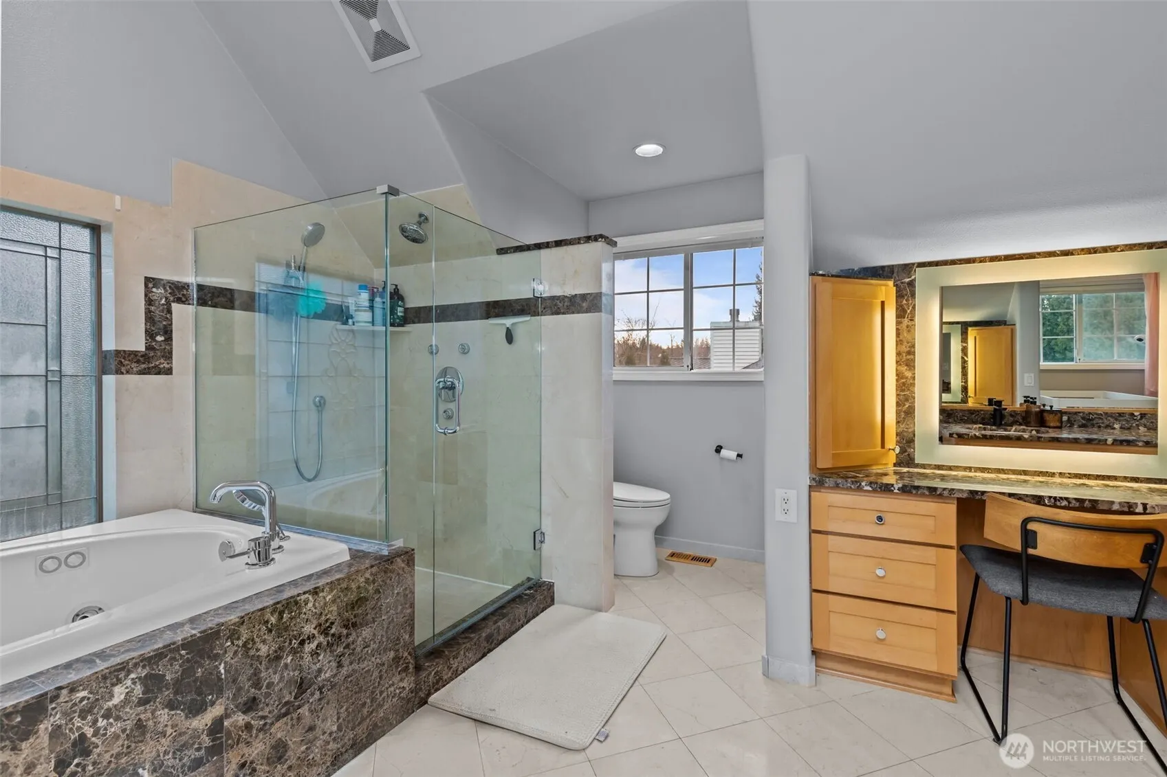 Privacy is so rare at this price! This home backs to a protected community greenbelt and walking path. No rear neighbors ever! At almost 2700sf, it’s thoughtfully designed and includes dramatic vaulted ceilings throughout, you have a ton of light and a larger flow vibes, two gas fireplaces, a bright open kitchen, and a professional sound studio. The gigantic primary suite is it’s own retreat, while two additional bedrooms, and a full bath complete the lower level. At the entry, you have a powder room, beautiful vaulted living room overlooking the yard, a flexible office/bedroom space, and the a grand entry staircase that WOW’s!