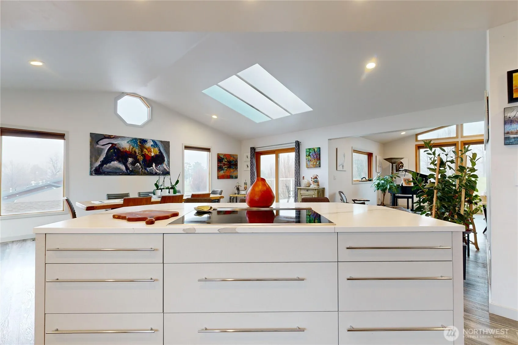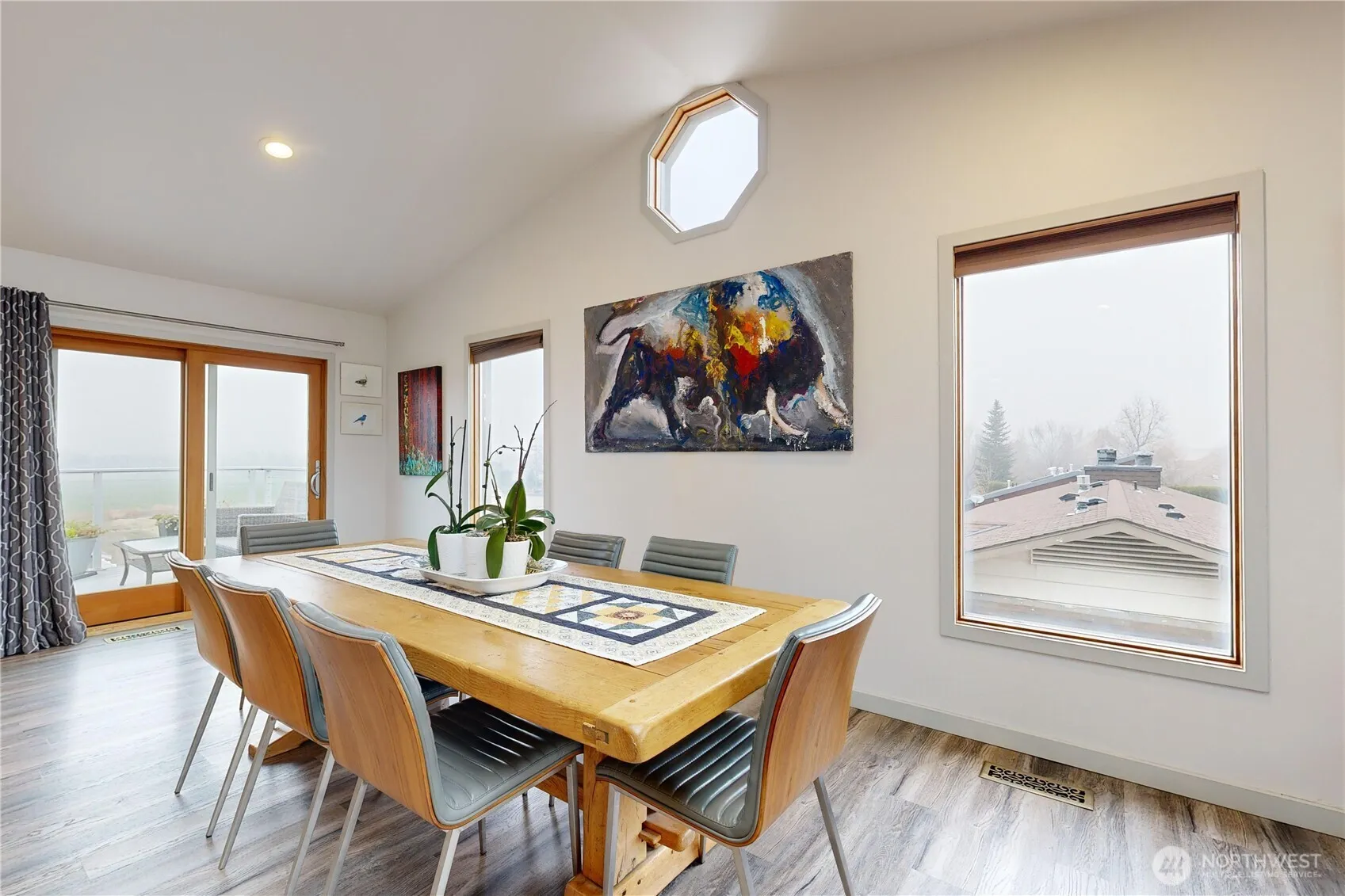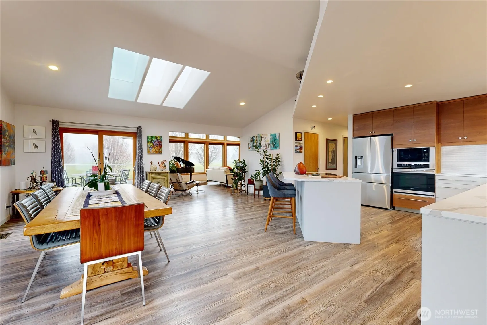 Set along the 14th fairway in a quiet cul-de-sac with minimal traffic, this remodeled home offers an open layout filled with natural light, vaulted ceilings, skylights, and a wall of windows framing golf course views. The main level opens into a spacious, connected living and dining area centered around an island kitchen, all oriented toward the views and outdoor access. The primary suite includes dual closets and a full bath with double sinks, soaking tub, and separate shower. Two additional bedrooms and a full bath complete the main floor. The daylight basement is well suited for extended living, multi-generational use, or guests, accessed by a walnut staircase that adds warmth and character. Highly versatile, it offers a large rec room with private exterior access, an additional room for office or media, a bedroom with egress window, a full bath with shower and sauna, a spacious laundry with folding aera, a bonus room ideal for wine or food storage, and a generous utility room with storage space. Outdoor living is designed with two decks: a west-facing deck to take in stunning sunsets and an east-facing deck to enjoy morning coffee overlooking the golf course. The landscaped, oversized backyard includes a retaining wall, patio, garden beds, and is fully fenced with two access gates. A 3-door garage with work area, plus a separate golf cart garage for additional storage. No HOA, offering more freedom and flexibility. Minutes to amenities, shopping, dining, and downtown.