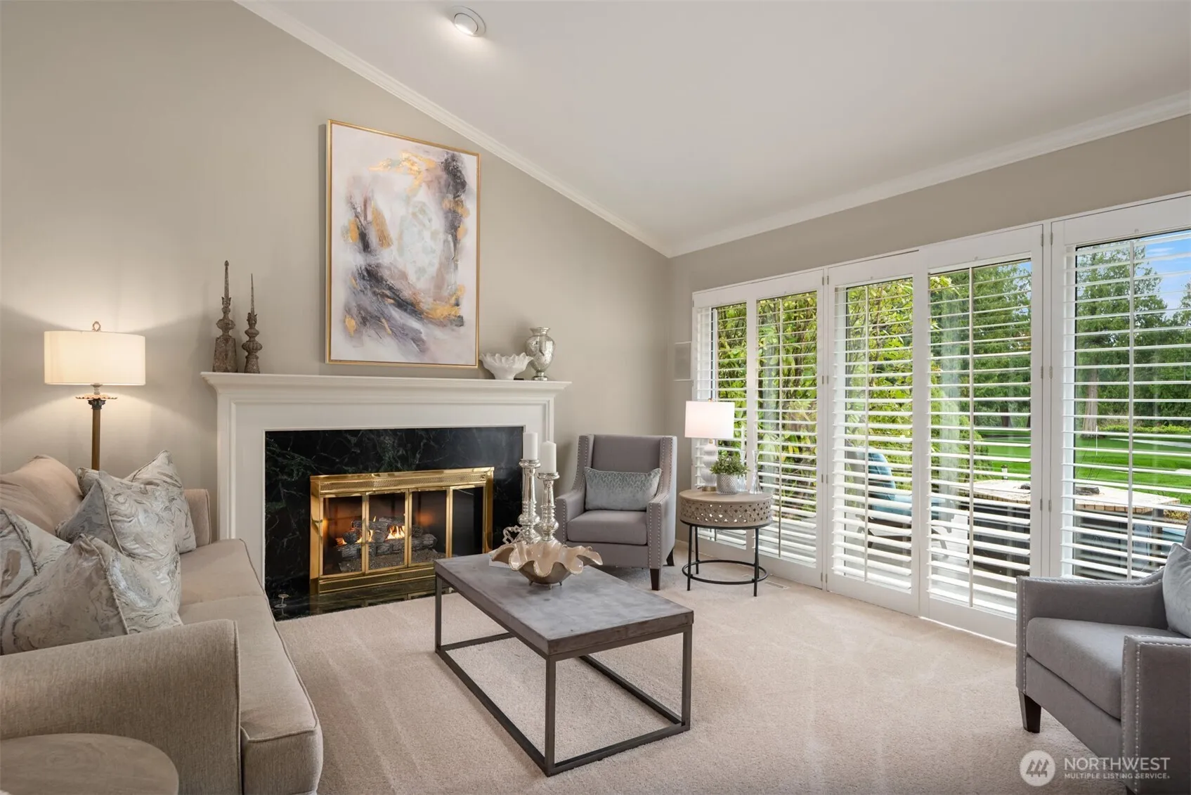 Imagine morning sunlight dancing through picturesque windows overlooking the fifth green of Sahalee’s renowned North Course. From the moment you enter, this exceptional residence welcomes you with vaulted ceilings in the formal dining room that seamlessly flow into an elegant living room, complete with a warm fireplace and sweeping golf course views. The main level offers refined comfort and effortless living, featuring an open-concept family room that blends beautifully with a designer kitchen. An expansive center island, stainless steel appliances, and walls of windows showcase serene, lush surroundings that create a tranquil, nature-filled backdrop. Vaulted ceilings, rich hardwoods, and a striking brick fireplace continue throughout, creating an inviting space ideal for both entertaining and everyday living. Retreat to the luxurious main-level primary suite, showcasing custom built-in bookcases, a wardrobe dresser, cozy fireplace, and a spacious walk-in closet. Step out onto the expansive deck to enjoy peaceful mornings with a cup of tea. The spa-inspired primary bath features dual sinks and a walk-in shower. Two additional generously sized bedrooms with ample closet space complete the main floor. Upstairs, discover a versatile bonus room with a wet bar, an inviting reading nook with built-in bookcases, and a fourth bedroom perfect for guests. This level also includes a full bath with a jetted tub and a private sauna, offering a relaxing retreat within your own home.
