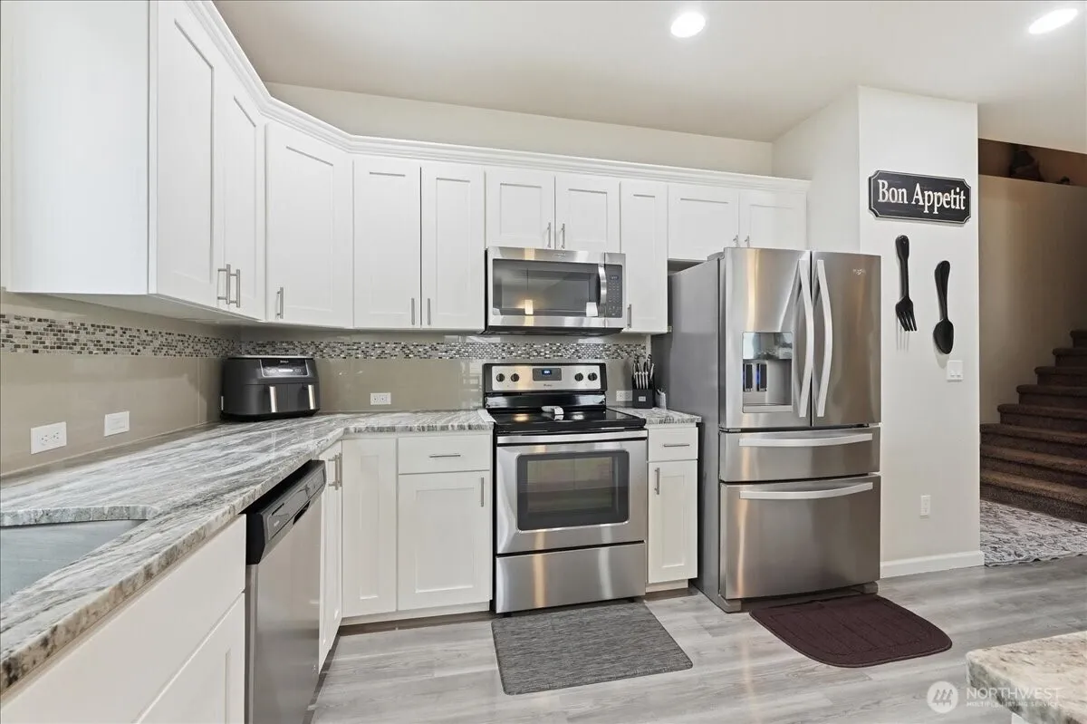 2470 SF 4 bedroom 3 bath with Primary Bedroom Suite on main floor. Great Room main floor plus Bonus Room 2nd floor.Vaulted ceilings expansive laminate wood floors and covered back patio with gourmet kitchen featuring white shaker style cabinets and crown molding. SS appliances, quartz kitchen counter tops. Best price for 4/3 2470 SF in the area!!