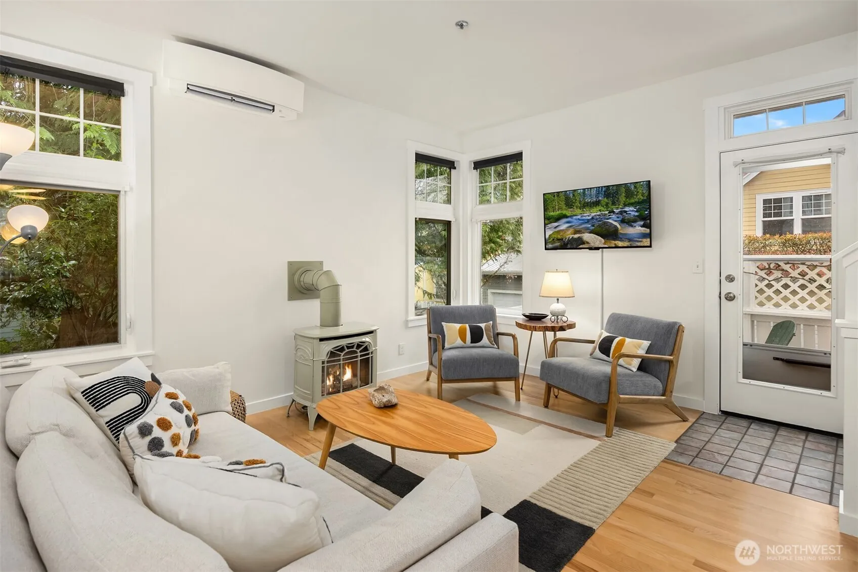A delightful in-town retreat! This standalone cottage is tucked within a charming, small cottage community on the edge of downtown Winslow. The light-filled, open-concept main level features hardwood floors, 9′ ceilings, a cozy propane fireplace and oversized windows. Step outside to a sunny, south-facing private deck—perfect for morning coffee, relaxing afternoons, or casual entertaining. Upstairs, vaulted ceilings enhance the airy feel of the home. Situated on a corner lot that backs to green space, the property enjoys a south-western orientation and added privacy. Recent updates include efficient mini-splits for heating and cooling, a washer and dryer, water heater, and a large kitchen sink. The home also includes an attached single-car garage with generous storage space. Ideally located near Winslow’s shops, restaurants, bakeries, theaters, parks, and the ferry, this home offers the perfect balance of peaceful living and in-town convenience. Low HOA dues of just $153/month make this charming cottage an exceptional opportunity.