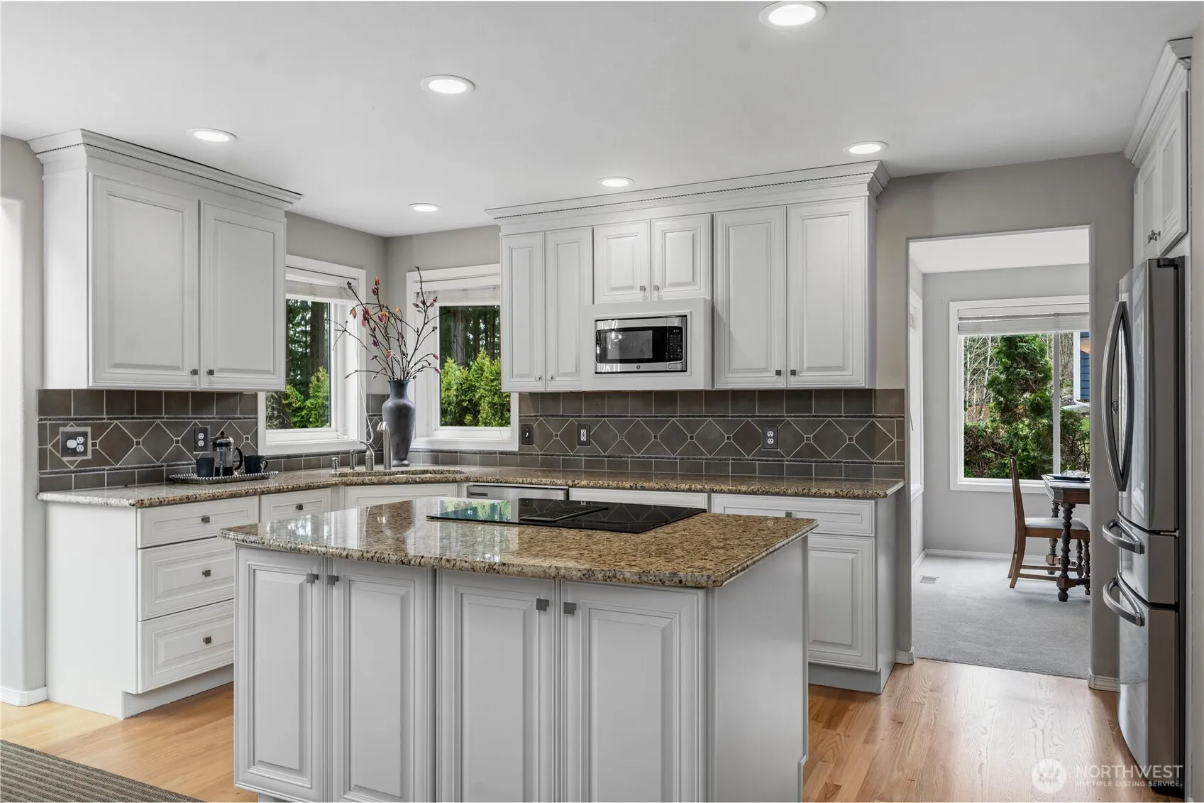 Tucked away on a private cul-de-sac near Lake Wilderness- this exceptional property offers the rare blend of privacy and lifestyle that is so hard to find. Enjoy Lake Wilderness views and direct trail access to the coveted Lake Wilderness Trail, with miles of scenic paths ideal for biking and walking. This location connects you to treasured nearby destinations including Lake Wilderness, the arboretum and the farmers market. A standout feature is the attached apartment-style living space, perfect for multigenerational living, guests, or potential rental income, renovated kitchenette, 3/4 bath, spacious living area with fireplace and vaulted ceiling, bedroom with vaulted ceiling, deck access, washer/dryer hookups, and garage access. The main home offers all of the spaces you crave, including formal rooms with large windows overlooking the lush grounds, a beautifully updated kitchen with beautiful cabinetry, granite countertops, and hardwood floors, casual dining with access to the newer TimberTech composite deck with aluminum railings, an inviting family room with fireplace. Upstairs are four generously sized bedrooms, including a spacious primary suite with a five-piece bath. Updates include recent interior paint, a one-year-old furnace, tankless water heater, and a 4-year-old presidential shake roof. Outside, enjoy Pacific Northwest woodland landscaping, a storybook yard with cobblestones, lawn, and rock accents, plus award-winning Tahoma Schools!