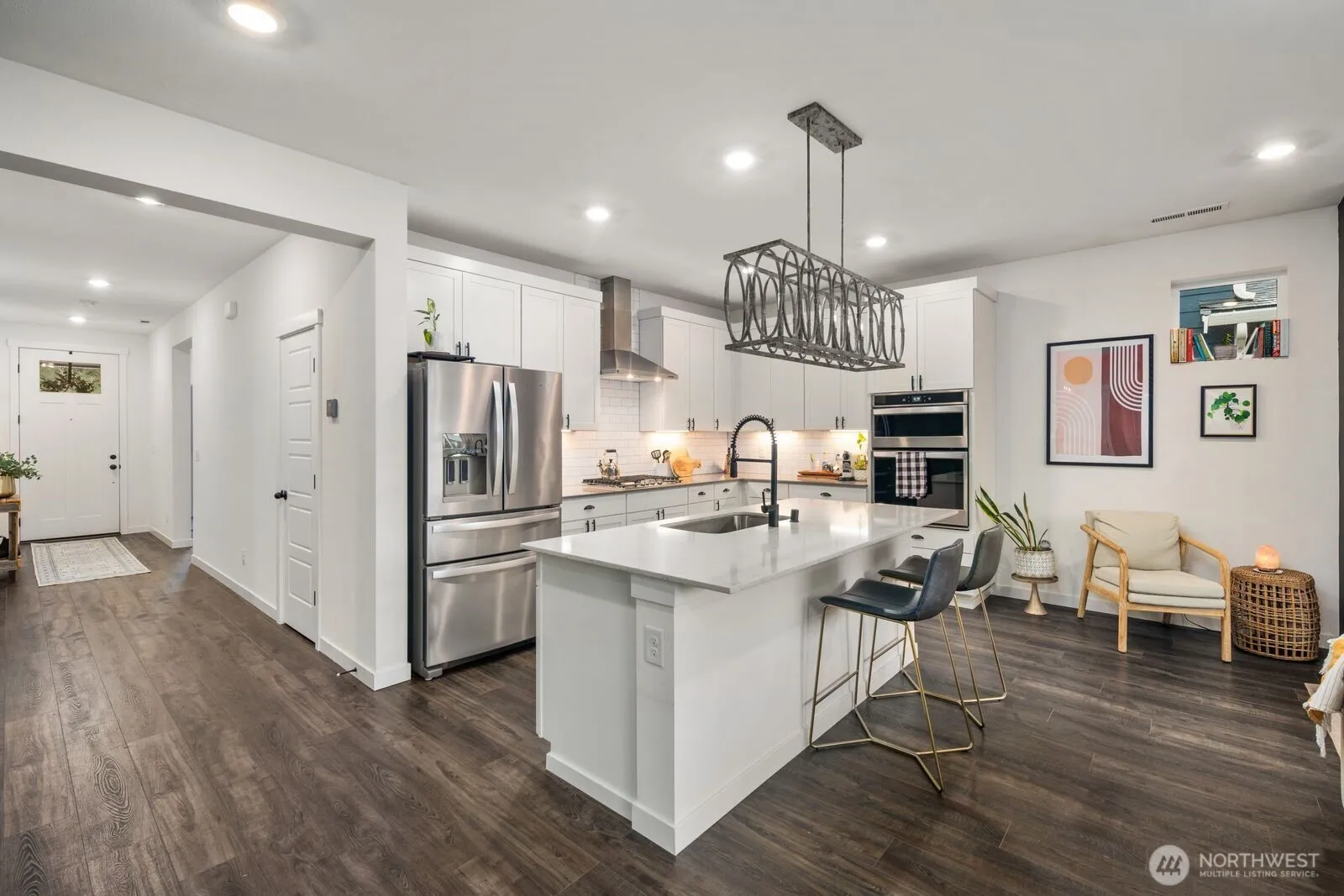 Welcome to this beautifully maintained 3 bedroom, 1.75 bath rambler in Bonney Lake’s sought after Falling Water community. Built in 2020, this single story home offers a bright open concept layout with thoughtful upgrades throughout. The kitchen features quartz countertops, subway tile backsplash, upgraded appliances, and a large center island that connects seamlessly to the dining and living spaces, creating a comfortable flow for gatherings and daily routines. Custom island lighting, upgraded interior doors, and a custom primary closet add distinctive design touches. The primary suite offers a private retreat with attached bath and generous storage. Additional features include ceiling fans and a tankless water heater for modern comfort and efficiency. Step outside to a fully landscaped yard with front and back sprinkler system and patio space, perfect for relaxing, entertaining, or enjoying the outdoor setting. Located in the Falling Water neighborhood of Bonney Lake, this home provides convenient access to nearby parks, trails, shopping, dining, and commuter routes. Built in 2020 and well maintained, this rambler offers modern design, functional space, and a desirable Bonney Lake location.