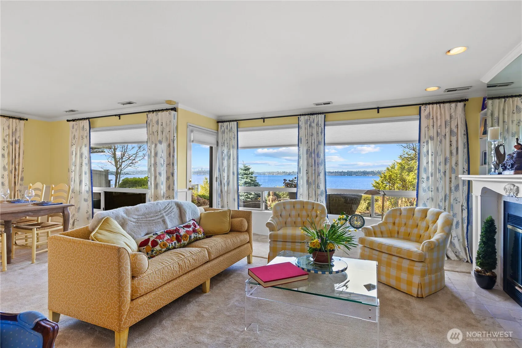 Amazing condo featuring unobstructed views of Lake Washington, Olympic mountains, marina and city with over 1,800 square feet of updated living space. There is a primary bedroom with ensuite, walk-in closet and fireplace, large guest bedroom and guest bath, laundry room, studio/off, formal living and dining rooms. All of the main rooms offer views including the studio. Outside features a private patio and garden with access from the living room plus there is a side garden with access from the office. The building has 9 units total and is very quiet. This is a MUST-SEE HOME.