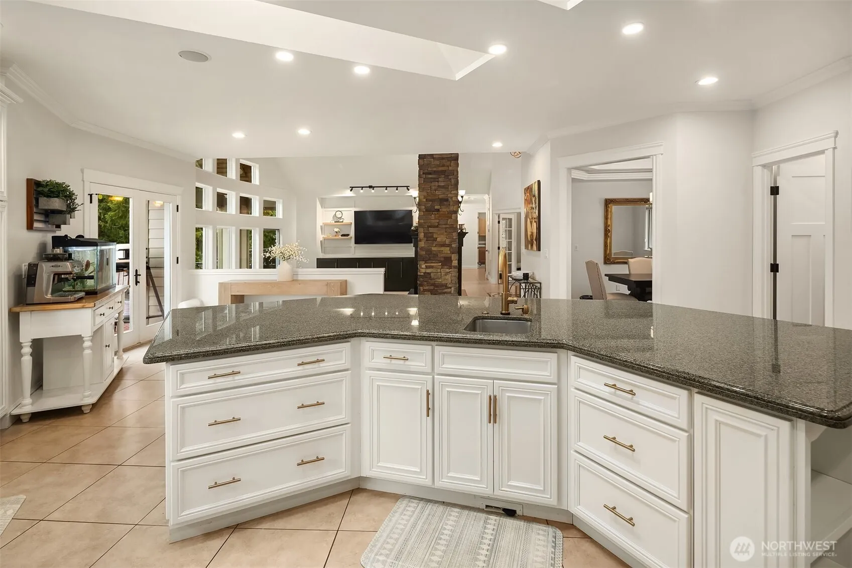 Freshly updated Echo Lake area estate—this timeless custom Craftsman daylight 4,350sqf rambler offers 4 bedrooms (3 en-suite), including a luxurious main floor primary, 3.5 baths, and a highly versatile layout. A grand entry welcomes you with a double-sided stacked stone fireplace and dramatic floor-to-ceiling curved window walls. The chef’s kitchen is designed for entertaining with an oversized island, prep sink, seating for 8, 48″ commercial gas range with double ovens, pot filler, crisp white cabinetry, and granite counters. Formal dining with coffered ceilings, plus two offices, great room, and spacious family room. Enjoy a private movie theater, gym, and sauna. The full daylight basement lives like a MIL with a second kitchen and W/D. Quality finishes include fresh paint, refined millwork, 9’ ceilings, 8’ doors, built-ins, and whole-home audio. Set on 2.8 gated acres with refreshed landscaping, fenced grounds, garden space, and privacy and hot tub, Complete with heat pump/AC, on-demand H2O, generator, two 3+ car garages, and a 36×36 RV garage—offering exceptional value.