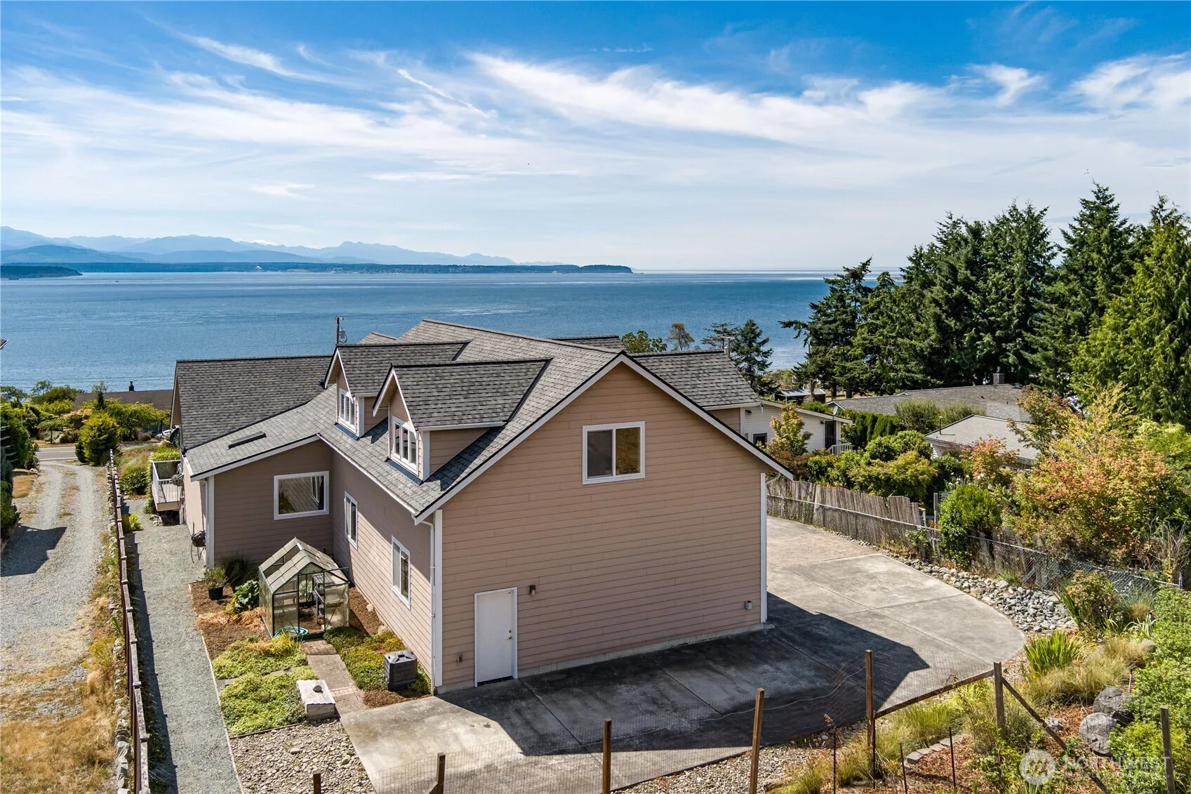 Fabulous Views from this spectacular 3100+ sqft home on wonderful Whidbey Island. This home features a Great room with Gourmet Kitchen for entertaining, Vaulted ceilings with skylights. Wall of windows and French doors on the View side. Primary suite is on the main floor, guest suite with continental bath is on the main floor. Spacious full length view deck. Upstairs has room for offices, crafts, TV area and has a private bath and storage closet. Oversized 3 car garage, garden area w/ greenhouse. 1500+- unfinished basement for future extra living space or shop. RV parking with electricity. New 30 year roof installed August 2025