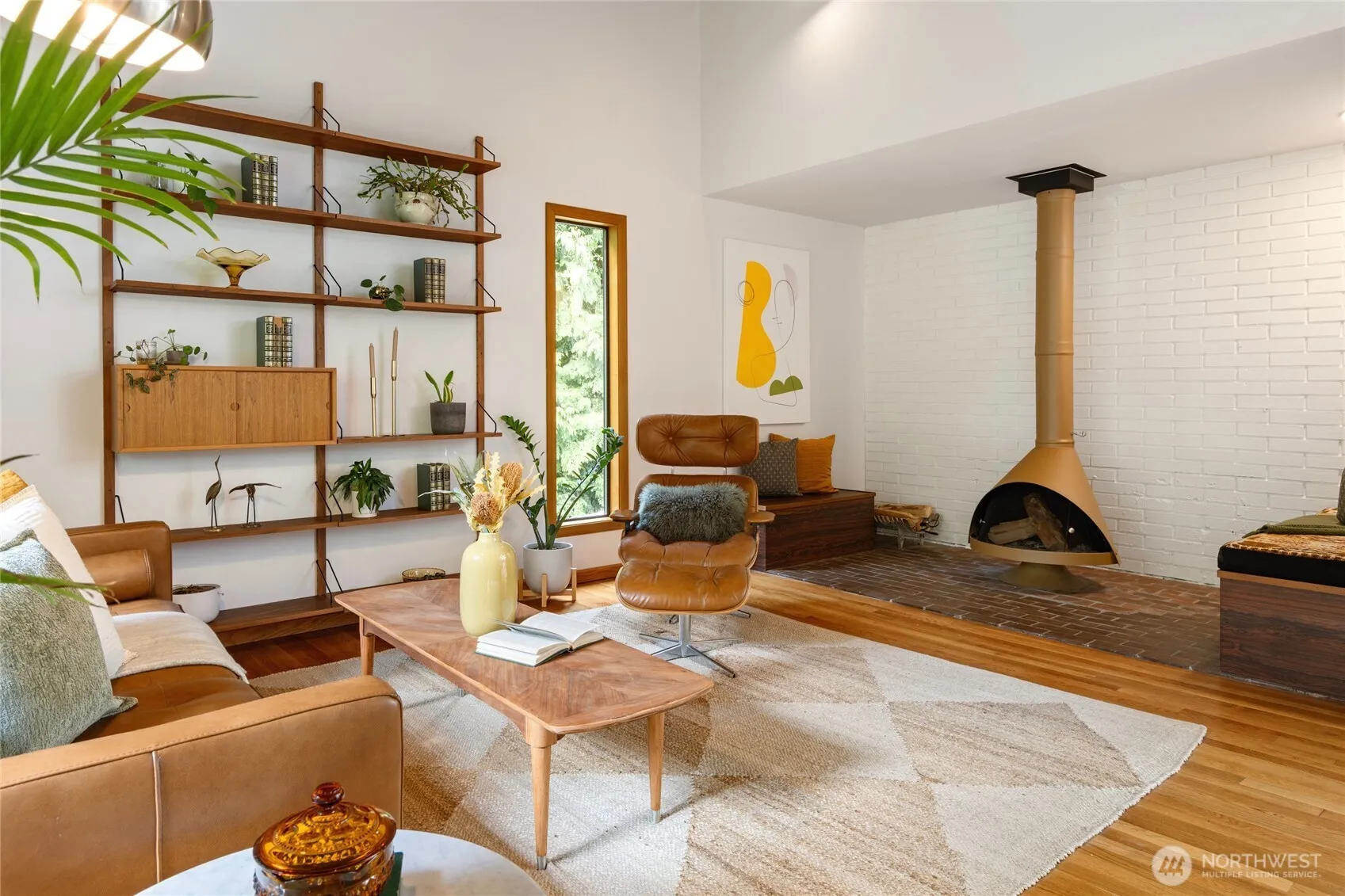 Truly one of a kind! Step into the dramatic skylight atrium & experience a home that perfectly blends iconic mid-century design with modern upgrades. Thoughtfully rebuilt, the owners refinished hardwood floors, preserved vaulted wood ceilings, and chose new fixtures to complement the mid-century modern style – like black floor-to-ceiling windows & a chic Malm fireplace. Major system updates include electric, plumbing, furnace, foundation, windows, new exterior paint, EV charging & a long-life metal roof. Fantastic layout with 4 beds, 4 baths, family room, flex spaces & tons of storage. There is truly room for everyone in this house! Set on nearly half an acre surrounded by trees, this exceptionally private sanctuary features sitting areas, garden beds, a greenhouse, lawn & huge Trex deck.
