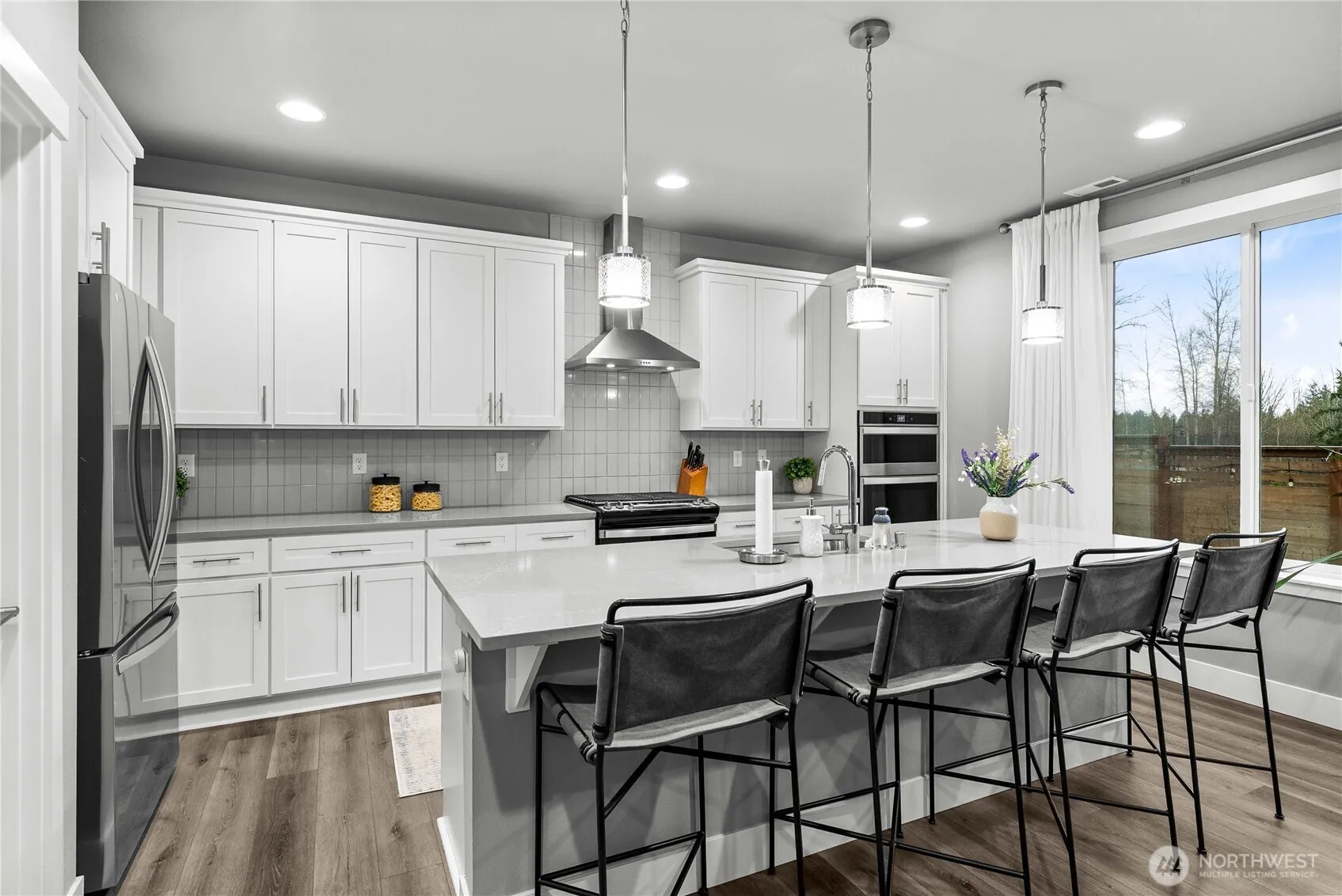 Tehaleh Heights Elementary serves this beautifully appointed Brookstone Cypress plan, ideally situated at the end of a quiet cul-de-sac on a private greenbelt lot with no neighbors behind. Designed for modern living, the main level features a bedroom and full bath—perfect for guests, multi-generational living, or a home office. The chef’s kitchen showcases an oversized island, 42” upper cabinetry, quartz countertops, full-height tile backsplash, double ovens, and a gas range with designer hood, all flowing seamlessly into the spacious great room with gas fireplace and built-in entertainment center. Upstairs, the luxurious primary suite offers a peaceful retreat, complemented by a versatile loft ideal for media, office, or additional living space. Designer finishes, including wood-wrapped windows, enhance the home throughout. Enjoy year-round outdoor living on the covered patio with gas fireplace, overlooking a serene protected greenbelt. Additional features include CAT6 wiring, Nest thermostat, central A/C, and EV charging capability. Located in the sought-after Tehaleh community with miles of trails, parks, and access to the Sumner-Bonney Lake School District.