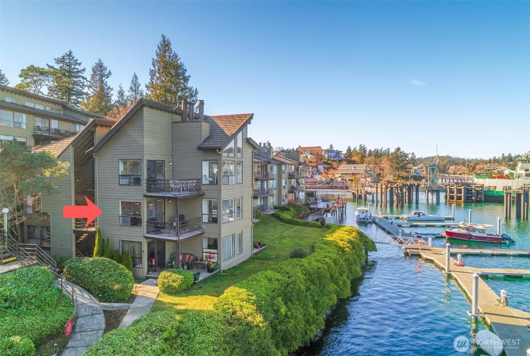 Absorb the island magic with floor to ceiling windows and hypnotic water views. This beautifully updated property offers 3-bedroom, 2-baths on one level with 1,413 sq ft of inviting coastal living. Take in the panoramic Friday Harbor views and enjoy the vibrant activity from your living room. Life is easy with low maintenance, amazing beauty, and incredible convenience. This bright, light, and open design features an interactive kitchen-family room, wood burning fireplace, and two private view decks. Enjoy morning coffee, stunning sunrises and sunsets, and dining al fresco on those perfect summer nights. Inside, the entire home has been thoughtfully remodeled with modern finishes and hardwood floors throughout, creating a fresh, clean, and stylish interior. Lovely furnishings are included, making this a truly turnkey opportunity. An entry deck with a generously sized storage locker adds practical convenience. Situated in the hub of Friday Harbor, you’re just a short stroll to the ferry, marina, shops, restaurants, and town amenities. A nearby covered parking space provides added ease. Ideal as a full-time residence, vacation retreat, or investment property, this exceptional waterfront condominium combines unbeatable location, stunning views, and refined modern comfort. Located in waterfront Cannery Village including lush landscaping, lovely walkways and gorgeous rock retaining walls within a community of stylish condominiums.