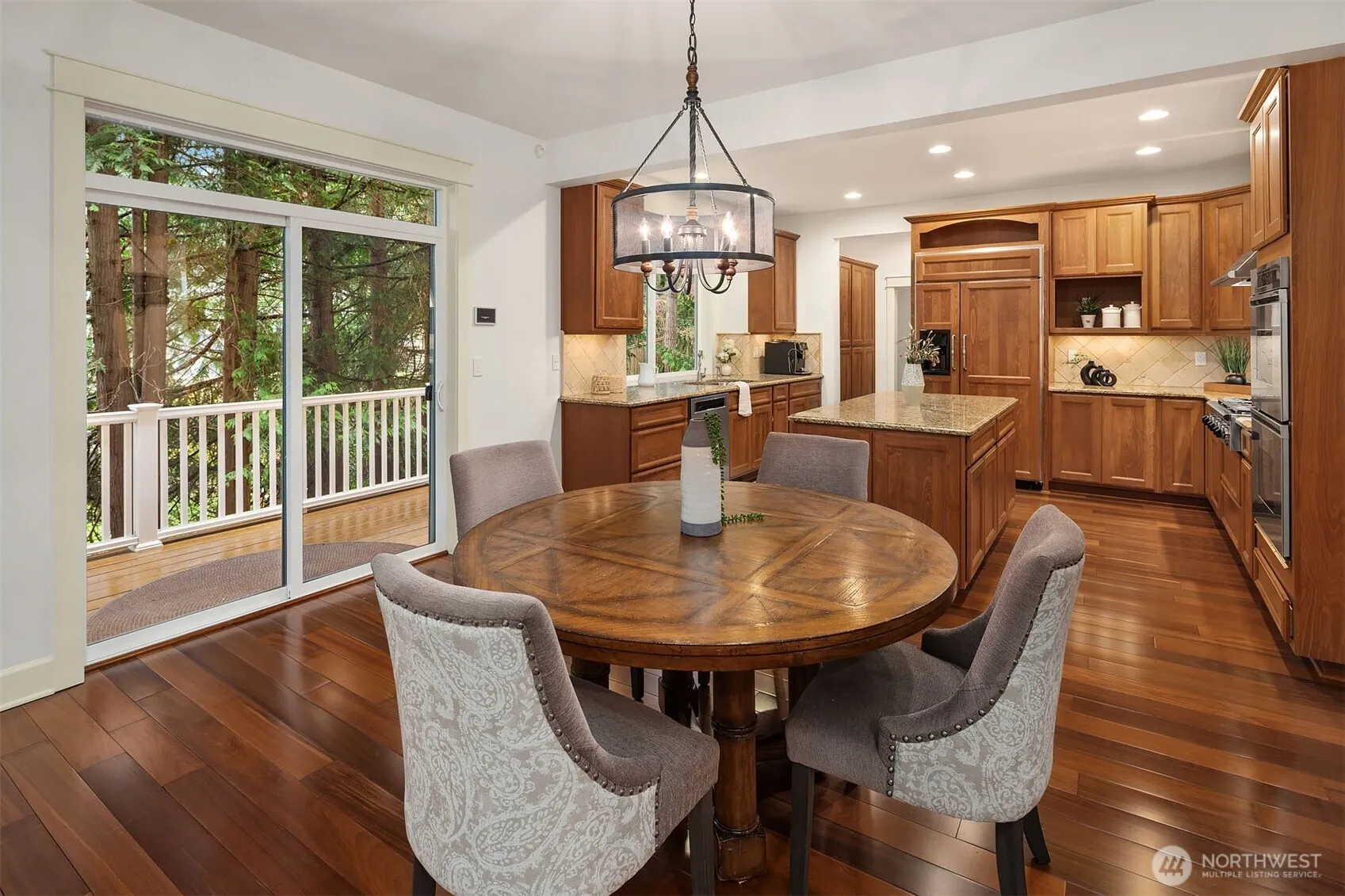 An appealing & functional floor plan designed to check every box. A dramatic 2-story entry welcomes you, where gorgeous hardwoods flow through the kitchen & formal living spaces, complemented by decorative tile, wood shutters & brilliant millwork. The spacious slab granite kitchen features high-end appliances, large island, abundant cabinetry, butler’s pantry with wet bar & wine cooler, dining area & a slider to the deck. Warm & inviting, the family room opens to the kitchen & includes a gas fireplace & box-beam ceilings. The elegant living & dining rooms offer an ideal venue for entertaining with French doors opening to the yard. The romantic primary suite boasts a sitting area & luxurious bath with 2 vanities, tile shower, soaking tub & walk-in closet with a 2nd washer/dryer. 3 additional bedrooms & a vaulted bonus room are just down the hall. A main-floor den with closet & access to the front deck. Escape to the lower level with a media room featuring a screen & projector, exercise room, 5th BR & full bath, perfect for guests. Generous windows & skylights fill the home with natural light. Fresh interior paint & new carpet, built-in speakers, CAT5, AC, hot tub & Control4 smart home system. Oversized 3-car, side-load garage with storage room. Enjoy stunning sunrises from the covered wrap-around deck. Private setting with tree-lined yard & protected areas on 2 sides. Ideally located on a non-thru road close to Microsoft, Bellevue, Kirkland, Redmond, Issaquah & Lake Sammamish.