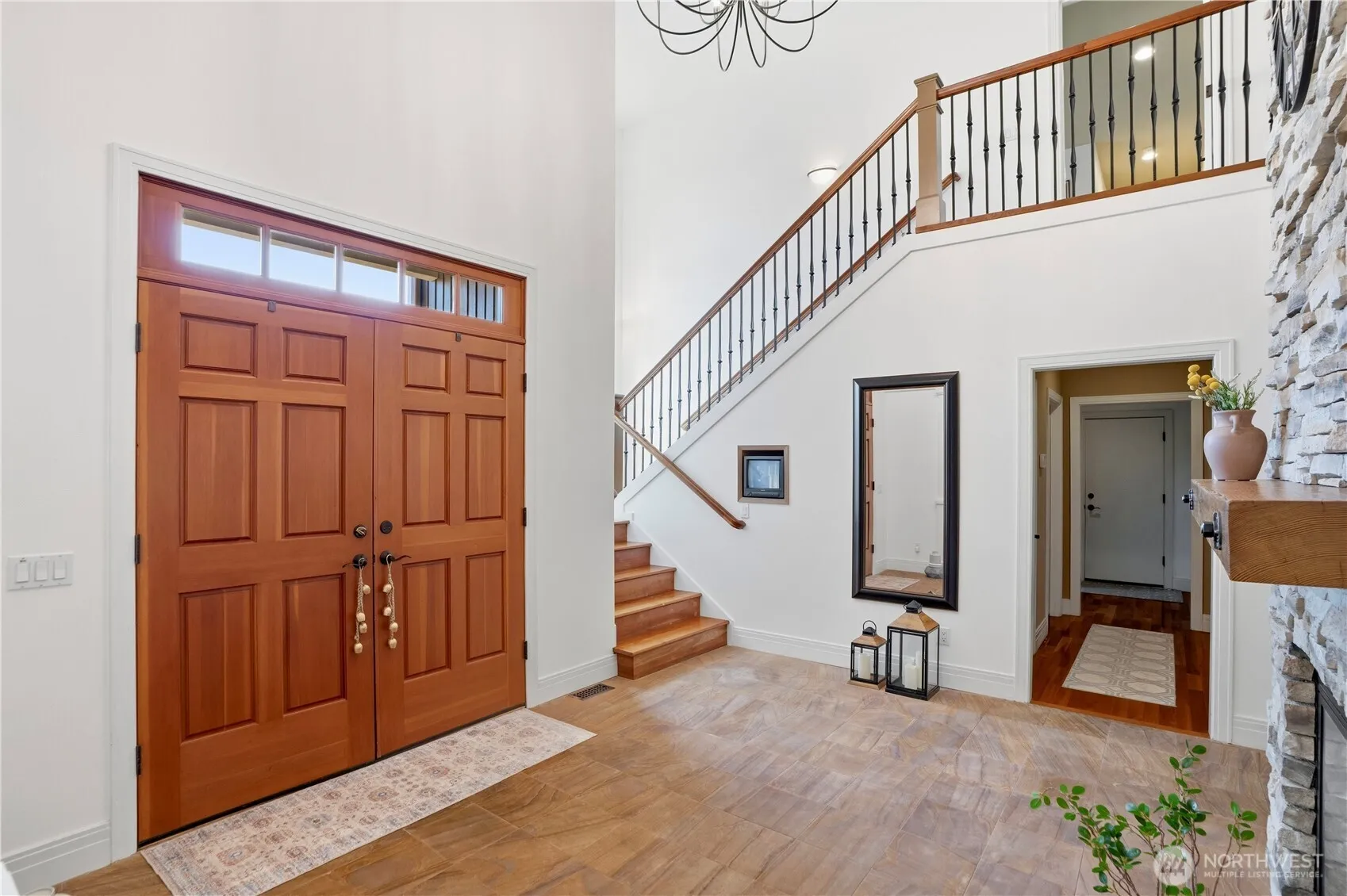 Experience the rare opportunity to own a home designed by a notable PNW architect for his own private residence. Nestled along the 14th fairway of the prestigious Washington National Estates, this property blends elevated craftsmanship with natural splendor. A graceful front fountain sets the tone for an interior defined by light and scale, anchored by a striking double-sided brick fireplace that serves as the home’s soulful centerpiece. The thoughtful layout balances privacy and connection. The main floor offers effortless living with a family room, great room, a gourmet kitchen with dedicated eating space, a formal dining room, a bonus room, and a spacious mudroom with built-ins, all enhanced by expansive windows that bring in abundant natural light and select outlooks toward the fairway. Upstairs, two private wings enhance livability: the primary suite features a spa-inspired ensuite and a balcony overlooking the golf course, while the secondary wing includes two additional bedrooms, two baths, a den, a bonus room, and a utility room. The backyard is a true standout, offering multiple secluded seating areas ideal for quiet mornings or evening entertaining. Modern essentials—such as A/C, dual tankless water heaters, and a premium concrete tile roof—ensure comfort and peace of mind. Elegant and custom-fit furniture is available for purchase and negotiable, offering a seamless, move-in ready opportunity.