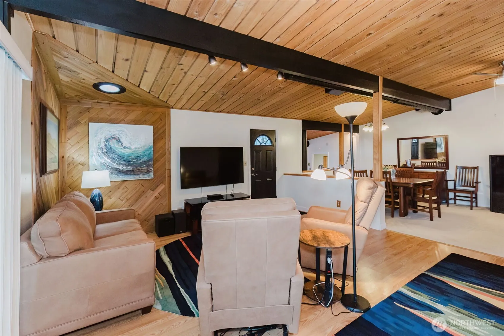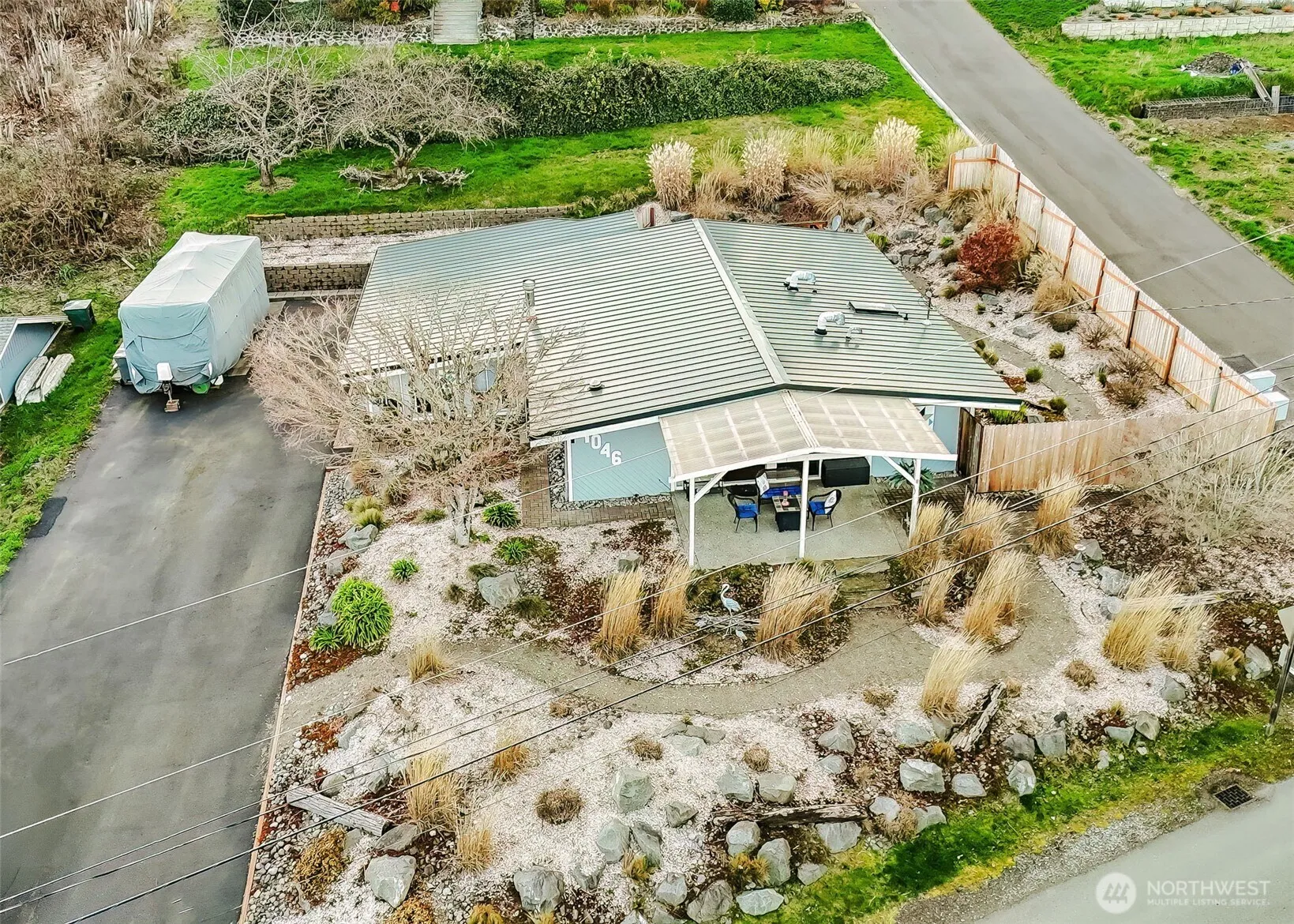 Stunning one-story Mid-Century Modern in desirable Manchester with sound and Mt. Rainier views! This thoughtfully designed 3-bedroom, 1.75-bath home showcases warm wood ceilings, exposed ducting, and timeless architectural character. Enjoy both living and family rooms plus a dedicated dining space—ideal for everyday living and entertaining. The updated kitchen features granite countertops and ample workspace. Recent major upgrades include a brand-new metal roof, new tankless hot water heater, new furnace, and heat pump for year-round comfort. The primary bath has been beautifully updated with a spacious walk-in shower. Step outside to manicured landscaping with a peaceful beach-path feel. Relax under the covered patio while taking in partial Sound views, or unwind in the included hot tub. The fully fenced backyard offers privacy, plus a workshop and additional storage room for hobbies and projects. Cozy up by the wood stove on chilly evenings. Abundant parking with room for an RV. Enjoy views of the Sound and Seattle from the neighborhood in this sought-after Manchester location. A rare blend of mid-century style, modern updates, and Northwest charm!