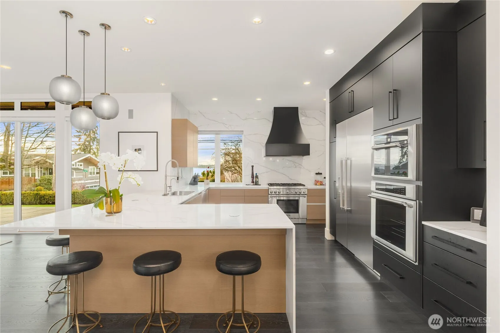 Timeless elegance meets bold design in this contemporary retreat, commanding attention with striking aesthetics and sweeping views. Set in desirable Houghton, just steps from Met Market & Lakeview Elementary. Rich black hardwoods anchor the main level, featuring a sleek chef’s kitchen with moody cabinetry, waterfall quartz island, & Thermador appliance suite with steam oven. Entertain in the expansive great room with linear gas fireplace & high-end audio system that flows to a heated view patio & turf yard. A dining room perfect for hosting, complemented by a guest suite, 3/4 bath, & private office. Upstairs find 3 en-suites including a luxurious primary with heated floors, dual shower, & absolutely giant closet. Access to a large view deck from primary & bonus room. Above it all, the rooftop deck offers stunning views of Lake Washington & Seattle skyline. Oversized 2 car garage wired for EV charging, elevator, hydronic heated floors, backup generator & fully motorized shades elevate everyday living in this exceptional home.