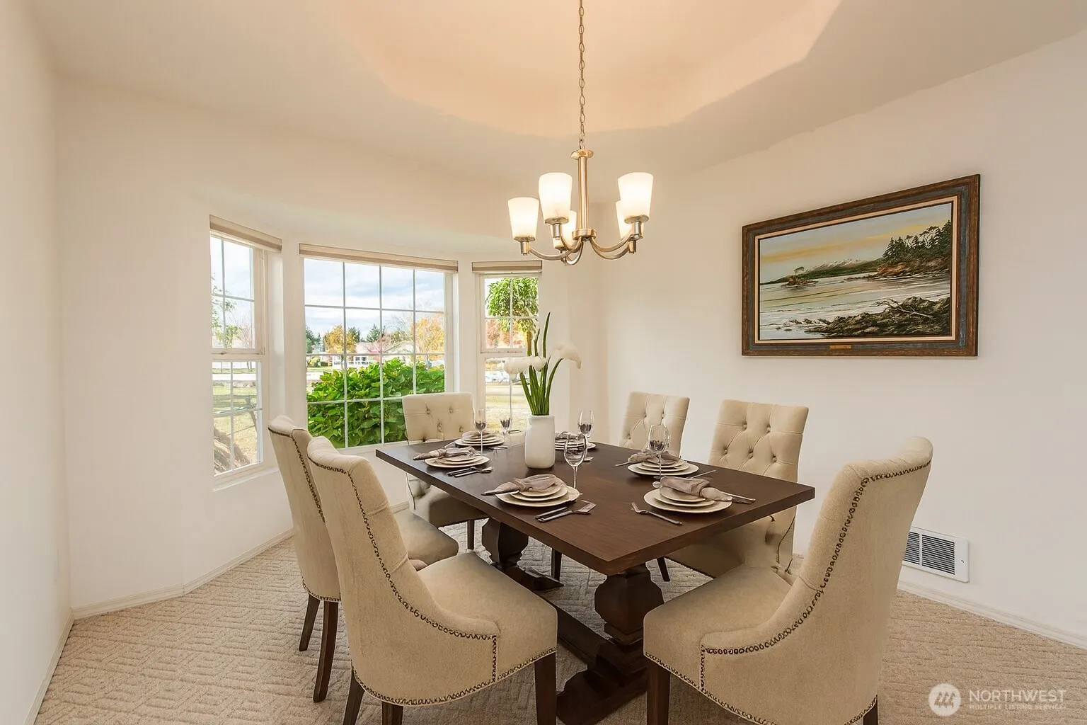 Carefree living in coveted Sherwood Village in downtown Sequim. Light-filled, single-level condo ideally positioned within the development, offering 1,603 SF, 3 bedrooms, and 2 bathrooms with tranquil views across a park-like greenbelt featuring mature trees/landscaping and a serene water feature to the west, plus partial Olympic Mountain views to the south. Enjoy an open-concept layout with a centrally located kitchen boasting white cabinetry, pantry, and breakfast nook, seamlessly connecting to the generous formal dining area and spacious great room with vaulted ceiling, wood-burning fireplace, and patio access. The primary suite with walk-in closet and ¾ bath is thoughtfully separated from two additional bedrooms and a full bath. Details include a newer ductless heat pump, faux hardwood flooring, neutral tones, and bay windows. Attached 323 SF garage with dedicated storage room. True lock-and-leave convenience with exterior maintenance/insurance, water, sewer, trash, and common area landscaping included for a low $434/month HOA. Just a short walk to the Discovery Trail, YMCA, medical facilities, and downtown amenities. Freshly cleaned and move-in ready!